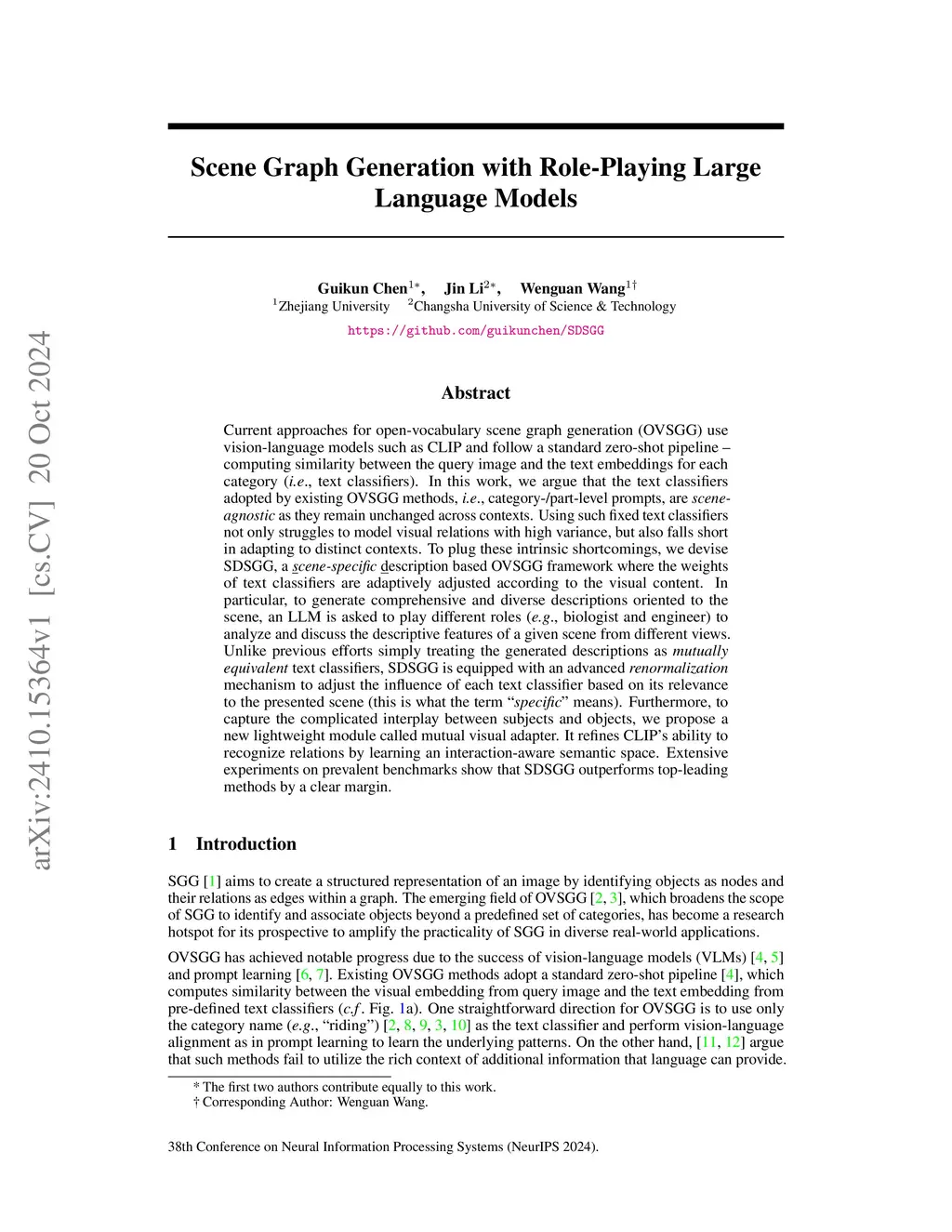 Current approaches for open-vocabulary scene graph generation (OVSGG) use vision-language models such as CLIP and follow a standard zero-shot pipeline -- computing similarity between the query image and the text embeddings for each category (i.e., text classifiers). In this work, we argue that the text classifiers adopted by existing OVSGG methods, i.e., category-/part-level prompts, are scene-agnostic as they remain unchanged across contexts. Using such fixed text classifiers not only struggles to model visual relations with high variance, but also falls short in adapting to distinct contexts. To plug these intrinsic shortcomings, we devise SDSGG, a scene-specific description based OVSGG framework where the weights of text classifiers are adaptively adjusted according to the visual content. In particular, to generate comprehensive and diverse descriptions oriented to the scene, an LLM is asked to play different roles (e.g., biologist and engineer) to analyze and discuss the descriptive features of a given scene from different views. Unlike previous efforts simply treating the generated descriptions as mutually equivalent text classifiers, SDSGG is equipped with an advanced renormalization mechanism to adjust the influence of each text classifier based on its relevance to the presented scene (this is what the term "specific" means). Furthermore, to capture the complicated interplay between subjects and objects, we propose a new lightweight module called mutual visual adapter. It refines CLIP's ability to recognize relations by learning an interaction-aware semantic space. Extensive experiments on prevalent benchmarks show that SDSGG outperforms top-leading methods by a clear margin.