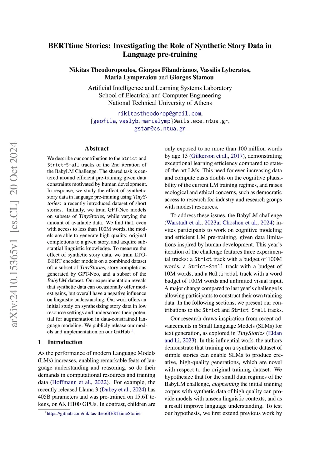 We describe our contribution to the Strict and Strict-Small tracks of the 2nd iteration of the BabyLM Challenge. The shared task is centered around efficient pre-training given data constraints motivated by human development. In response, we study the effect of synthetic story data in language pre-training using TinyStories: a recently introduced dataset of short stories. Initially, we train GPT-Neo models on subsets of TinyStories, while varying the amount of available data. We find that, even with access to less than 100M words, the models are able to generate high-quality, original completions to a given story, and acquire substantial linguistic knowledge. To measure the effect of synthetic story data, we train LTG-BERT encoder models on a combined dataset of: a subset of TinyStories, story completions generated by GPT-Neo, and a subset of the BabyLM dataset. Our experimentation reveals that synthetic data can occasionally offer modest gains, but overall have a negative influence on linguistic understanding. Our work offers an initial study on synthesizing story data in low resource settings and underscores their potential for augmentation in data-constrained language modeling. We publicly release our models and implementation on our GitHub.
