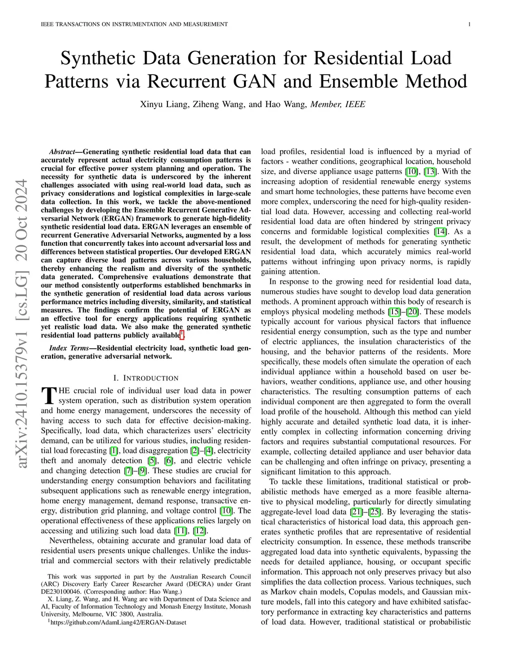 Generating synthetic residential load data that can accurately represent actual electricity consumption patterns is crucial for effective power system planning and operation. The necessity for synthetic data is underscored by the inherent challenges associated with using real-world load data, such as privacy considerations and logistical complexities in large-scale data collection. In this work, we tackle the above-mentioned challenges by developing the Ensemble Recurrent Generative Adversarial Network (ERGAN) framework to generate high-fidelity synthetic residential load data. ERGAN leverages an ensemble of recurrent Generative Adversarial Networks, augmented by a loss function that concurrently takes into account adversarial loss and differences between statistical properties. Our developed ERGAN can capture diverse load patterns across various households, thereby enhancing the realism and diversity of the synthetic data generated. Comprehensive evaluations demonstrate that our method consistently outperforms established benchmarks in the synthetic generation of residential load data across various performance metrics including diversity, similarity, and statistical measures. The findings confirm the potential of ERGAN as an effective tool for energy applications requiring synthetic yet realistic load data. We also make the generated synthetic residential load patterns publicly available.