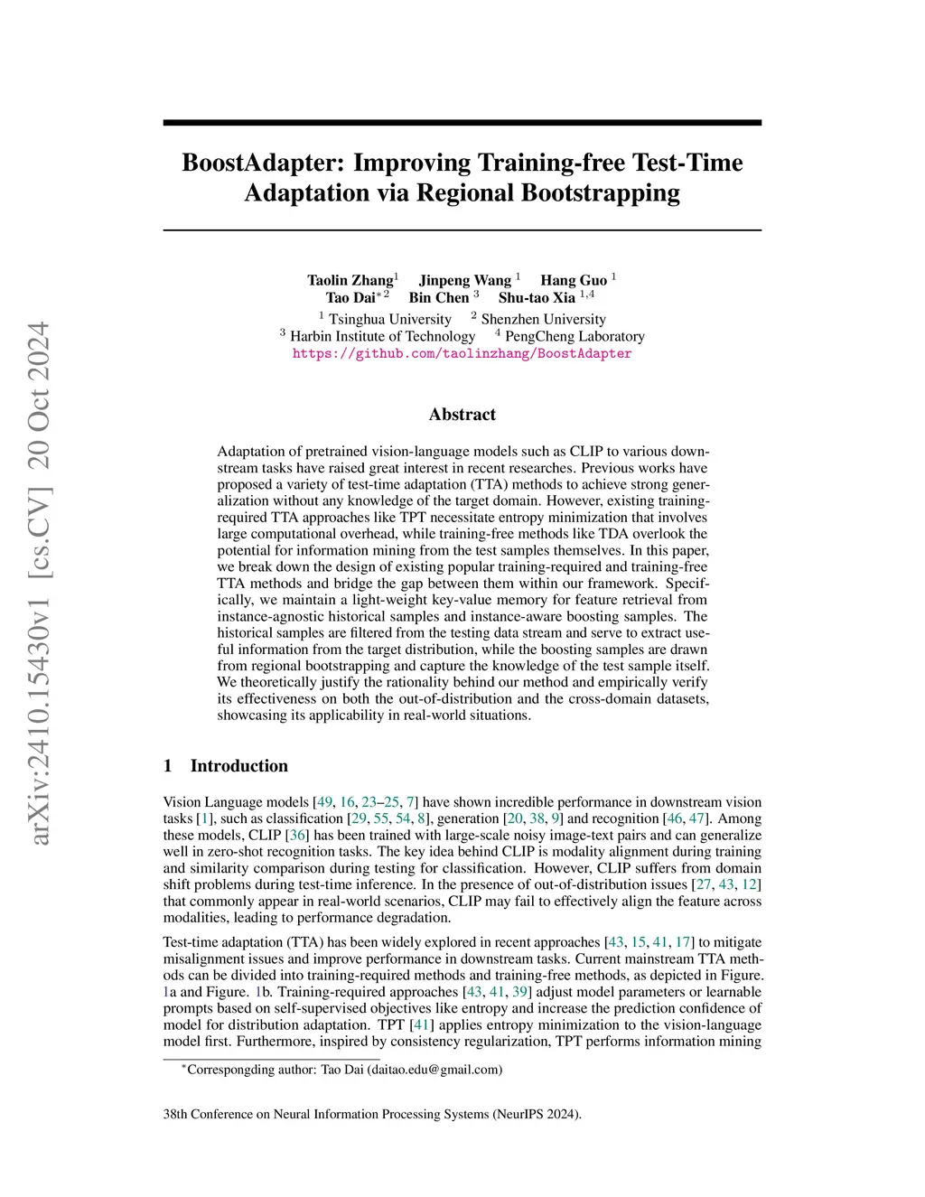 Adaptation of pretrained vision-language models such as CLIP to various downstream tasks have raised great interest in recent researches. Previous works have proposed a variety of test-time adaptation (TTA) methods to achieve strong generalization without any knowledge of the target domain. However, existing training-required TTA approaches like TPT necessitate entropy minimization that involves large computational overhead, while training-free methods like TDA overlook the potential for information mining from the test samples themselves. In this paper, we break down the design of existing popular training-required and training-free TTA methods and bridge the gap between them within our framework. Specifically, we maintain a light-weight key-value memory for feature retrieval from instance-agnostic historical samples and instance-aware boosting samples. The historical samples are filtered from the testing data stream and serve to extract useful information from the target distribution, while the boosting samples are drawn from regional bootstrapping and capture the knowledge of the test sample itself. We theoretically justify the rationality behind our method and empirically verify its effectiveness on both the out-of-distribution and the cross-domain datasets, showcasing its applicability in real-world situations.