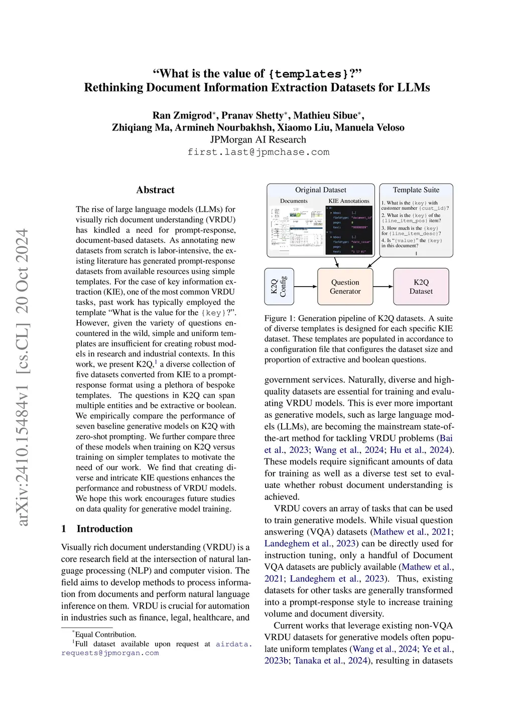 The rise of large language models (LLMs) for visually rich document understanding (VRDU) has kindled a need for prompt-response, document-based datasets. As annotating new datasets from scratch is labor-intensive, the existing literature has generated prompt-response datasets from available resources using simple templates. For the case of key information extraction (KIE), one of the most common VRDU tasks, past work has typically employed the template "What is the value for the {key}?". However, given the variety of questions encountered in the wild, simple and uniform templates are insufficient for creating robust models in research and industrial contexts. In this work, we present K2Q, a diverse collection of five datasets converted from KIE to a prompt-response format using a plethora of bespoke templates. The questions in K2Q can span multiple entities and be extractive or boolean. We empirically compare the performance of seven baseline generative models on K2Q with zero-shot prompting. We further compare three of these models when training on K2Q versus training on simpler templates to motivate the need of our work. We find that creating diverse and intricate KIE questions enhances the performance and robustness of VRDU models. We hope this work encourages future studies on data quality for generative model training.