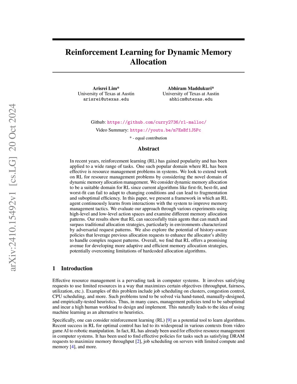 Reinforcement Learning for Dynamic Memory Allocation