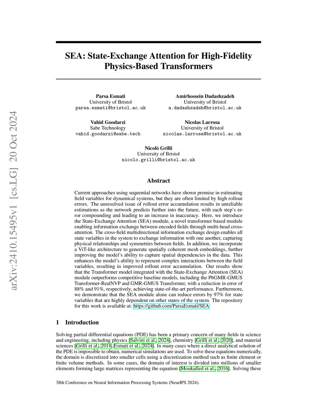 Current approaches using sequential networks have shown promise in estimating field variables for dynamical systems, but they are often limited by high rollout errors. The unresolved issue of rollout error accumulation results in unreliable estimations as the network predicts further into the future, with each step's error compounding and leading to an increase in inaccuracy. Here, we introduce the State-Exchange Attention (SEA) module, a novel transformer-based module enabling information exchange between encoded fields through multi-head cross-attention. The cross-field multidirectional information exchange design enables all state variables in the system to exchange information with one another, capturing physical relationships and symmetries between fields. Additionally, we introduce an efficient ViT-like mesh autoencoder to generate spatially coherent mesh embeddings for a large number of meshing cells. The SEA integrated transformer demonstrates the state-of-the-art rollout error compared to other competitive baselines. Specifically, we outperform PbGMR-GMUS Transformer-RealNVP and GMR-GMUS Transformer, with a reduction in error of 88% and 91%, respectively. Furthermore, we demonstrate that the SEA module alone can reduce errors by 97% for state variables that are highly dependent on other states of the system. The repository for this work is available at: https://github.com/ParsaEsmati/SEA
