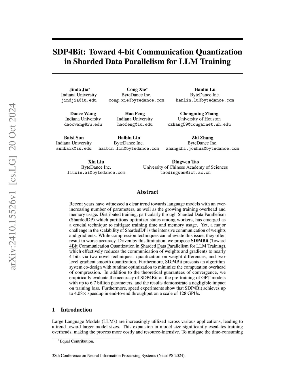 Recent years have witnessed a clear trend towards language models with an ever-increasing number of parameters, as well as the growing training overhead and memory usage. Distributed training, particularly through Sharded Data Parallelism (ShardedDP) which partitions optimizer states among workers, has emerged as a crucial technique to mitigate training time and memory usage. Yet, a major challenge in the scalability of ShardedDP is the intensive communication of weights and gradients. While compression techniques can alleviate this issue, they often result in worse accuracy. Driven by this limitation, we propose SDP4Bit (Toward 4Bit Communication Quantization in Sharded Data Parallelism for LLM Training), which effectively reduces the communication of weights and gradients to nearly 4 bits via two novel techniques: quantization on weight differences, and two-level gradient smooth quantization. Furthermore, SDP4Bit presents an algorithm-system co-design with runtime optimization to minimize the computation overhead of compression. In addition to the theoretical guarantees of convergence, we empirically evaluate the accuracy of SDP4Bit on the pre-training of GPT models with up to 6.7 billion parameters, and the results demonstrate a negligible impact on training loss. Furthermore, speed experiments show that SDP4Bit achieves up to 4.08 speedup in end-to-end throughput on a scale of 128 GPUs.