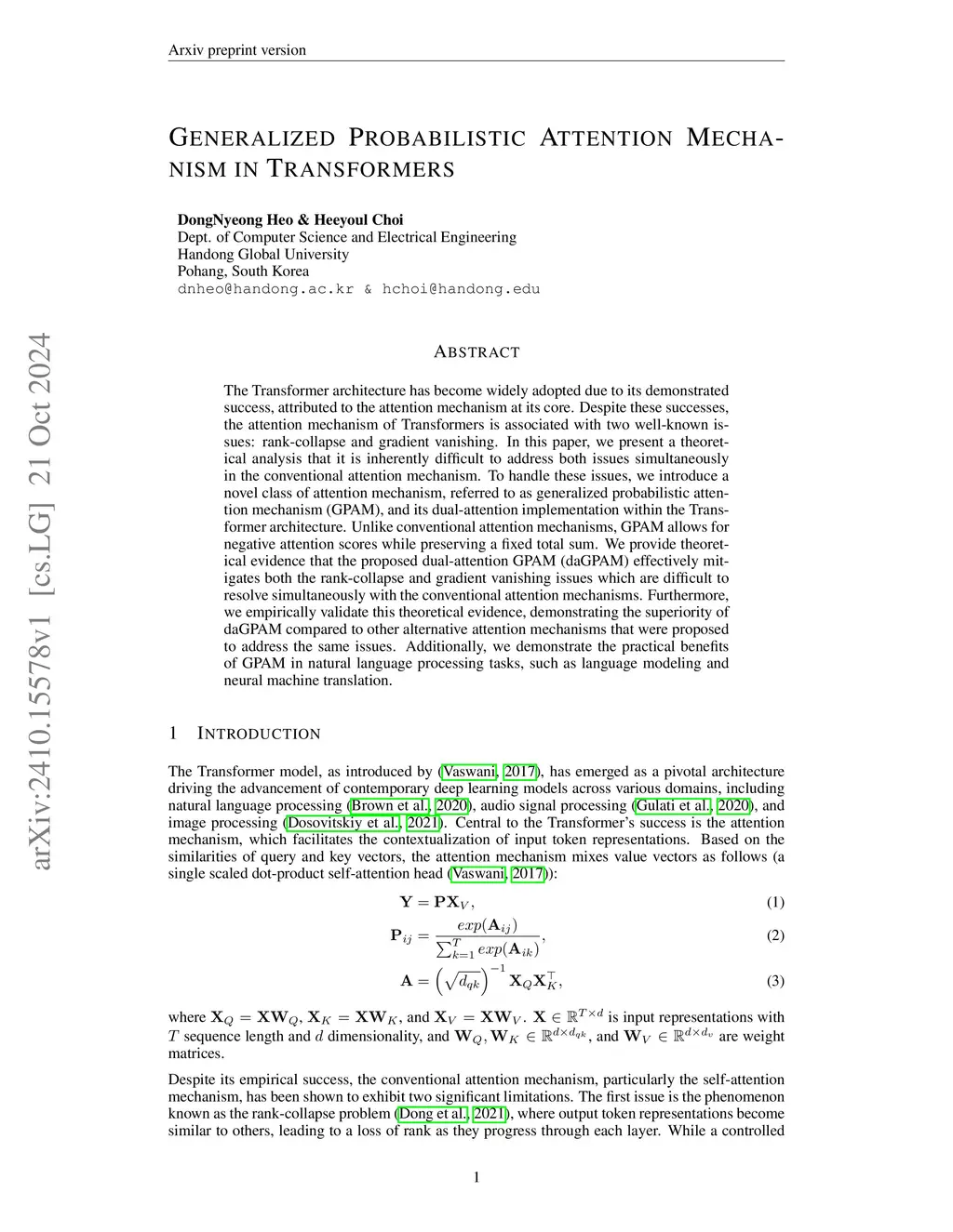 The Transformer architecture has become widely adopted due to its demonstrated success, attributed to the attention mechanism at its core. Despite these successes, the attention mechanism of Transformers is associated with two well-known issues: rank-collapse and gradient vanishing. In this paper, we present a theoretical analysis that it is inherently difficult to address both issues simultaneously in the conventional attention mechanism. To handle these issues, we introduce a novel class of attention mechanism, referred to as generalized probabilistic attention mechanism (GPAM), and its dual-attention implementation within the Transformer architecture. Unlike conventional attention mechanisms, GPAM allows for negative attention scores while preserving a fixed total sum. We provide theoretical evidence that the proposed dual-attention GPAM (daGPAM) effectively mitigates both the rank-collapse and gradient vanishing issues which are difficult to resolve simultaneously with the conventional attention mechanisms. Furthermore, we empirically validate this theoretical evidence, demonstrating the superiority of daGPAM compared to other alternative attention mechanisms that were proposed to address the same issues. Additionally, we demonstrate the practical benefits of GPAM in natural language processing tasks, such as language modeling and neural machine translation.