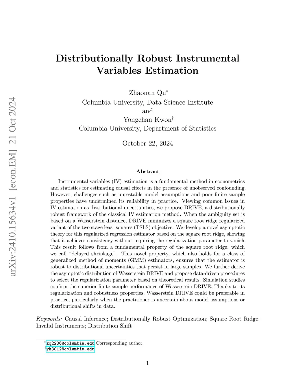 Instrumental variables (IV) estimation is a fundamental method in econometrics and statistics for estimating causal effects in the presence of unobserved confounding. However, challenges such as untestable model assumptions and poor finite sample properties have undermined its reliability in practice. Viewing common issues in IV estimation as distributional uncertainties, we propose DRIVE, a distributionally robust framework of the classical IV estimation method. When the ambiguity set is based on a Wasserstein distance, DRIVE minimizes a square root ridge regularized variant of the two stage least squares (TSLS) objective. We develop a novel asymptotic theory for this regularized regression estimator based on the square root ridge, showing that it achieves consistency without requiring the regularization parameter to vanish. This result follows from a fundamental property of the square root ridge, which we call ``delayed shrinkage''. This novel property, which also holds for a class of generalized method of moments (GMM) estimators, ensures that the estimator is robust to distributional uncertainties that persist in large samples. We further derive the asymptotic distribution of Wasserstein DRIVE and propose data-driven procedures to select the regularization parameter based on theoretical results. Simulation studies confirm the superior finite sample performance of Wasserstein DRIVE. Thanks to its regularization and robustness properties, Wasserstein DRIVE could be preferable in practice, particularly when the practitioner is uncertain about model assumptions or distributional shifts in data.