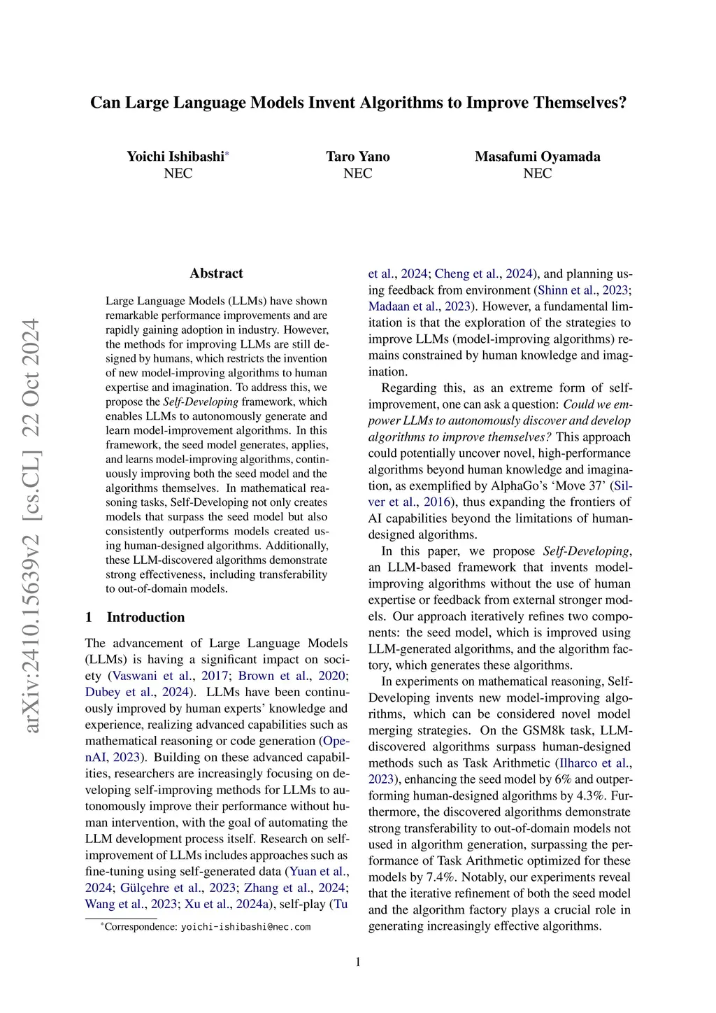 Large Language Models (LLMs) have achieved remarkable capabilities, yet their improvement methods remain fundamentally constrained by human design. We present Self-Developing, a framework that enables LLMs to autonomously discover, implement, and refine their own improvement algorithms. Our approach employs an iterative cycle where a seed model generates algorithmic candidates as executable code, evaluates their effectiveness, and uses Direct Preference Optimization to recursively improve increasingly sophisticated improvement strategies. We demonstrate this framework through model merging, a practical technique for combining specialized models. Self-Developing successfully discovered novel merging algorithms that outperform existing human-designed algorithms. On mathematical reasoning benchmarks, the autonomously discovered algorithms improve the seed model's GSM8k performance by 6\% and exceed human-designed approaches like Task Arithmetic by 4.3\%. Remarkably, these algorithms exhibit strong generalization, achieving 7.4\% gains on out-of-domain models without re-optimization. Our findings demonstrate that LLMs can transcend their training to invent genuinely novel optimization techniques. This capability represents a crucial step toward a new era where LLMs not only solve problems but autonomously develop the methodologies for their own advancement.