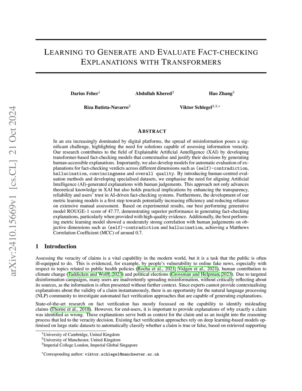 In an era increasingly dominated by digital platforms, the spread of misinformation poses a significant challenge, highlighting the need for solutions capable of assessing information veracity. Our research contributes to the field of Explainable Artificial Antelligence (XAI) by developing transformer-based fact-checking models that contextualise and justify their decisions by generating human-accessible explanations. Importantly, we also develop models for automatic evaluation of explanations for fact-checking verdicts across different dimensions such as \texttt{(self)-contradiction}, \texttt{hallucination}, \texttt{convincingness} and \texttt{overall quality}. By introducing human-centred evaluation methods and developing specialised datasets, we emphasise the need for aligning Artificial Intelligence (AI)-generated explanations with human judgements. This approach not only advances theoretical knowledge in XAI but also holds practical implications by enhancing the transparency, reliability and users' trust in AI-driven fact-checking systems. Furthermore, the development of our metric learning models is a first step towards potentially increasing efficiency and reducing reliance on extensive manual assessment. Based on experimental results, our best performing generative model \textsc{ROUGE-1} score of 47.77, demonstrating superior performance in generating fact-checking explanations, particularly when provided with high-quality evidence. Additionally, the best performing metric learning model showed a moderately strong correlation with human judgements on objective dimensions such as \texttt{(self)-contradiction and \texttt{hallucination}, achieving a Matthews Correlation Coefficient (MCC) of around 0.7.}