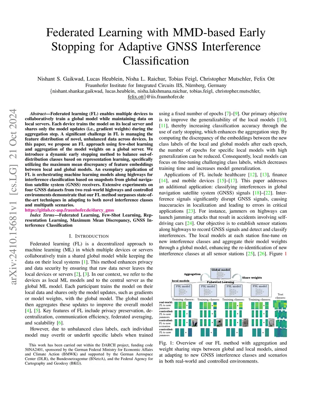 Federated learning (FL) enables multiple devices to collaboratively train a global model while maintaining data on local servers. Each device trains the model on its local server and shares only the model updates (i.e., gradient weights) during the aggregation step. A significant challenge in FL is managing the feature distribution of novel and unbalanced data across devices. In this paper, we propose an FL approach using few-shot learning and aggregation of the model weights on a global server. We introduce a dynamic early stopping method to balance out-of-distribution classes based on representation learning, specifically utilizing the maximum mean discrepancy of feature embeddings between local and global models. An exemplary application of FL is to orchestrate machine learning models along highways for interference classification based on snapshots from global navigation satellite system (GNSS) receivers. Extensive experiments on four GNSS datasets from two real-world highways and controlled environments demonstrate that our FL method surpasses state-of-the-art techniques in adapting to both novel interference classes and multipath scenarios.