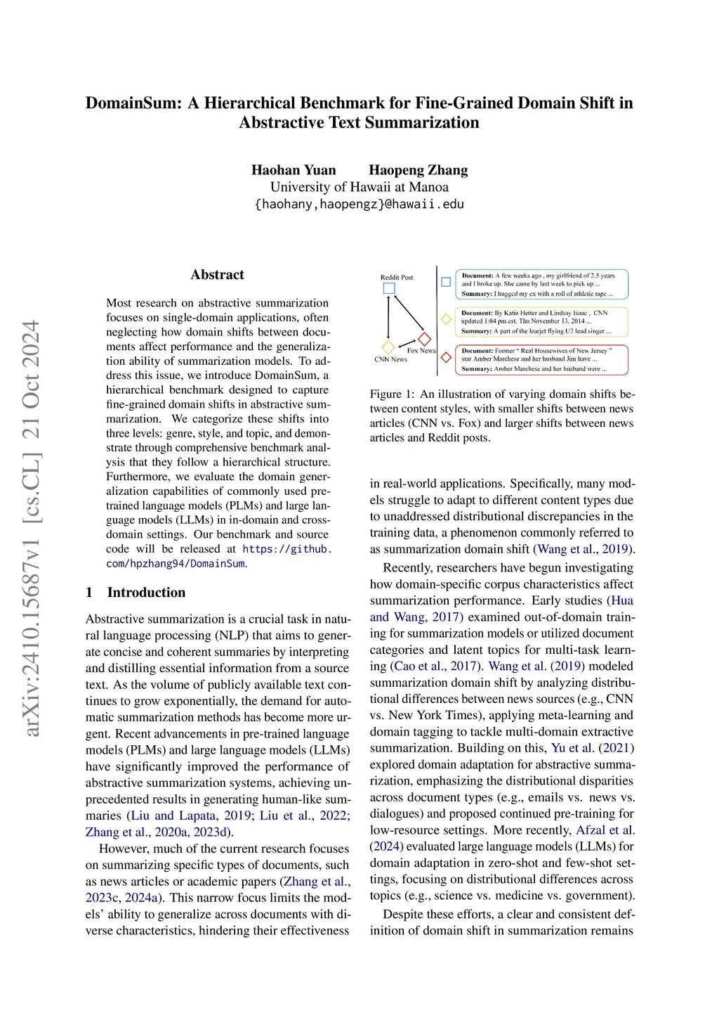 Most research on abstractive summarization focuses on single-domain applications, often neglecting how domain shifts between documents affect performance and the generalization ability of summarization models. To address this issue, we introduce DomainSum, a hierarchical benchmark designed to capture fine-grained domain shifts in abstractive summarization. We categorize these shifts into three levels: genre, style, and topic, and demonstrate through comprehensive benchmark analysis that they follow a hierarchical structure. Furthermore, we evaluate the domain generalization capabilities of commonly used pre-trained language models (PLMs) and large language models (LLMs) in in-domain and cross-domain settings.
