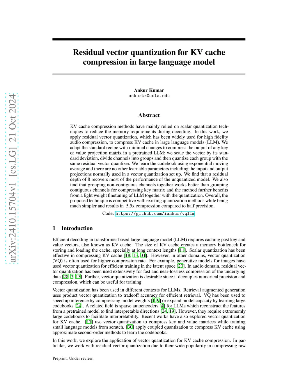 KV cache compression methods have mainly relied on scalar quantization techniques to reduce the memory requirements during decoding. In this work, we apply residual vector quantization, which has been widely used for high fidelity audio compression, to compress KV cache in large language models (LLM). We adapt the standard recipe with minimal changes to compress the output of any key or value projection matrix in a pretrained LLM: we scale the vector by its standard deviation, divide channels into groups and then quantize each group with the same residual vector quantizer. We learn the codebook using exponential moving average and there are no other learnable parameters including the input and output projections normally used in a vector quantization set up. We find that a residual depth of 8 recovers most of the performance of the unquantized model. We also find that grouping non-contiguous channels together works better than grouping contiguous channels for compressing key matrix and the method further benefits from a light weight finetuning of LLM together with the quantization. Overall, the proposed technique is competitive with existing quantization methods while being much simpler and results in 5.5x compression compared to half precision.