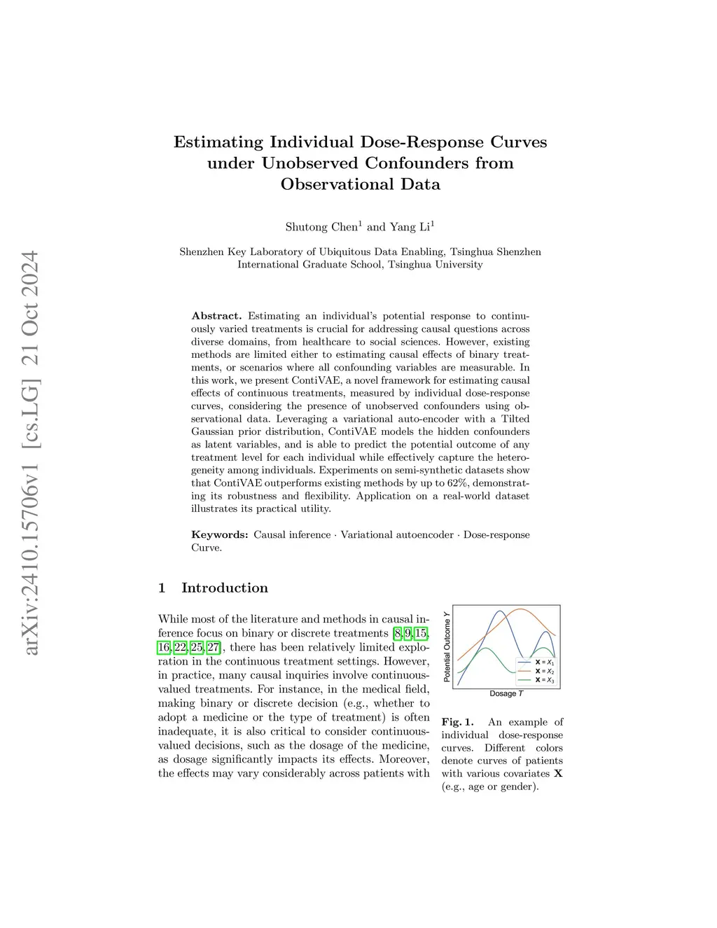 Estimating an individual's potential response to continuously varied treatments is crucial for addressing causal questions across diverse domains, from healthcare to social sciences. However, existing methods are limited either to estimating causal effects of binary treatments, or scenarios where all confounding variables are measurable. In this work, we present ContiVAE, a novel framework for estimating causal effects of continuous treatments, measured by individual dose-response curves, considering the presence of unobserved confounders using observational data. Leveraging a variational auto-encoder with a Tilted Gaussian prior distribution, ContiVAE models the hidden confounders as latent variables, and is able to predict the potential outcome of any treatment level for each individual while effectively capture the heterogeneity among individuals. Experiments on semi-synthetic datasets show that ContiVAE outperforms existing methods by up to 62%, demonstrating its robustness and flexibility. Application on a real-world dataset illustrates its practical utility.