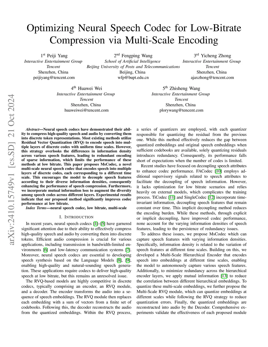Neural speech codecs have demonstrated their ability to compress high-quality speech and audio by converting them into discrete token representations. Most existing methods utilize Residual Vector Quantization (RVQ) to encode speech into multiple layers of discrete codes with uniform time scales. However, this strategy overlooks the differences in information density across various speech features, leading to redundant encoding of sparse information, which limits the performance of these methods at low bitrate. This paper proposes MsCodec, a novel multi-scale neural speech codec that encodes speech into multiple layers of discrete codes, each corresponding to a different time scale. This encourages the model to decouple speech features according to their diverse information densities, consequently enhancing the performance of speech compression. Furthermore, we incorporate mutual information loss to augment the diversity among speech codes across different layers. Experimental results indicate that our proposed method significantly improves codec performance at low bitrate.