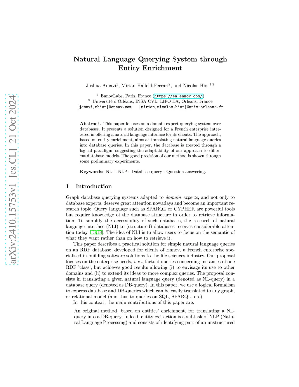 This paper focuses on a domain expert querying system over databases. It presents a solution designed for a French enterprise interested in offering a natural language interface for its clients. The approach, based on entity enrichment, aims at translating natural language queries into database queries. In this paper, the database is treated through a logical paradigm, suggesting the adaptability of our approach to different database models. The good precision of our method is shown through some preliminary experiments.