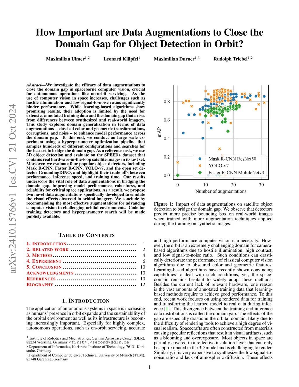 We investigate the efficacy of data augmentations to close the domain gap in spaceborne computer vision, crucial for autonomous operations like on-orbit servicing. As the use of computer vision in space increases, challenges such as hostile illumination and low signal-to-noise ratios significantly hinder performance. While learning-based algorithms show promising results, their adoption is limited by the need for extensive annotated training data and the domain gap that arises from differences between synthesized and real-world imagery. This study explores domain generalization in terms of data augmentations -- classical color and geometric transformations, corruptions, and noise -- to enhance model performance across the domain gap. To this end, we conduct an large scale experiment using a hyperparameter optimization pipeline that samples hundreds of different configurations and searches for the best set to bridge the domain gap. As a reference task, we use 2D object detection and evaluate on the SPEED+ dataset that contains real hardware-in-the-loop satellite images in its test set. Moreover, we evaluate four popular object detectors, including Mask R-CNN, Faster R-CNN, YOLO-v7, and the open set detector GroundingDINO, and highlight their trade-offs between performance, inference speed, and training time. Our results underscore the vital role of data augmentations in bridging the domain gap, improving model performance, robustness, and reliability for critical space applications. As a result, we propose two novel data augmentations specifically developed to emulate the visual effects observed in orbital imagery. We conclude by recommending the most effective augmentations for advancing computer vision in challenging orbital environments. Code for training detectors and hyperparameter search will be made publicly available.