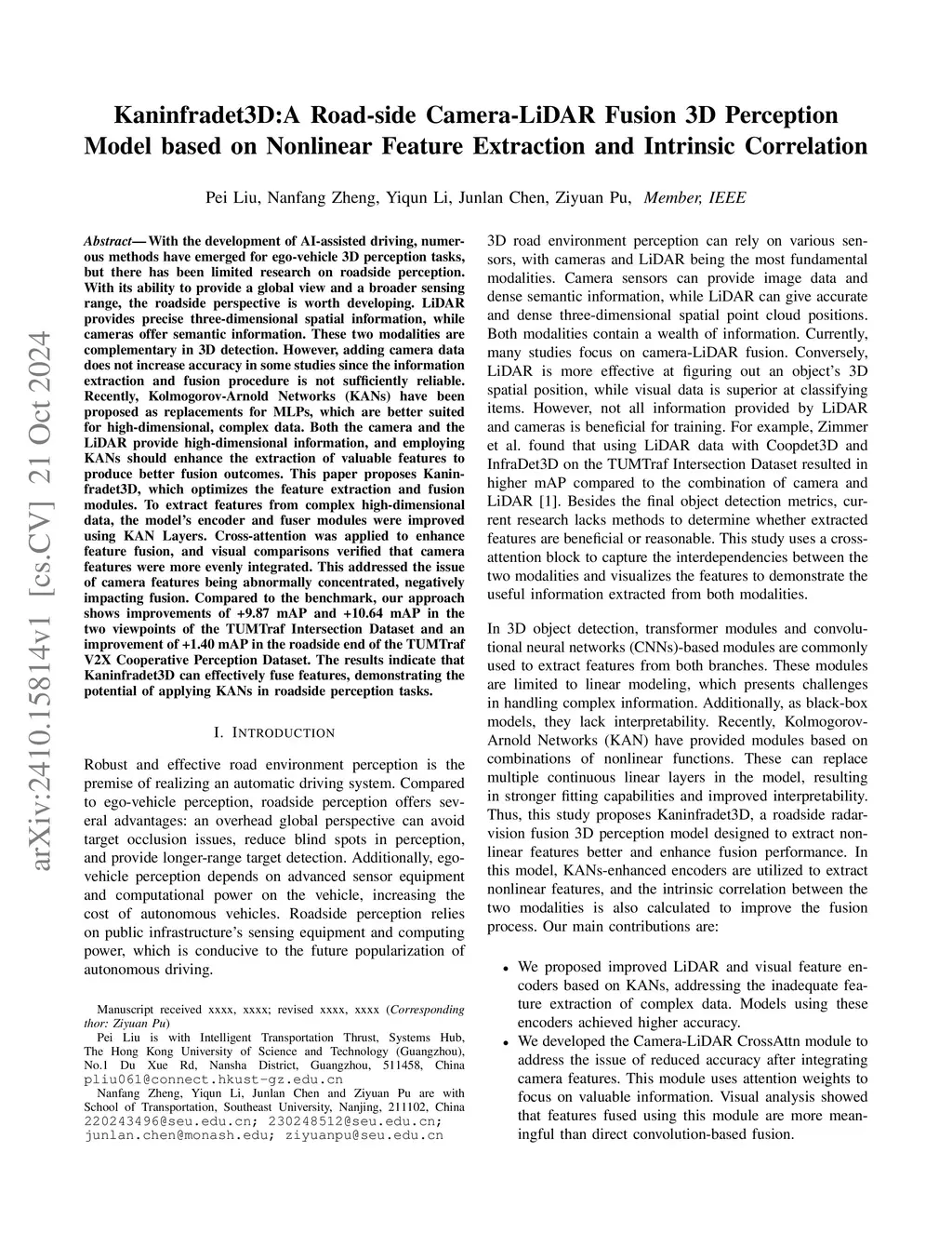 With the development of AI-assisted driving, numerous methods have emerged for ego-vehicle 3D perception tasks, but there has been limited research on roadside perception. With its ability to provide a global view and a broader sensing range, the roadside perspective is worth developing. LiDAR provides precise three-dimensional spatial information, while cameras offer semantic information. These two modalities are complementary in 3D detection. However, adding camera data does not increase accuracy in some studies since the information extraction and fusion procedure is not sufficiently reliable. Recently, Kolmogorov-Arnold Networks (KANs) have been proposed as replacements for MLPs, which are better suited for high-dimensional, complex data. Both the camera and the LiDAR provide high-dimensional information, and employing KANs should enhance the extraction of valuable features to produce better fusion outcomes. This paper proposes Kaninfradet3D, which optimizes the feature extraction and fusion modules. To extract features from complex high-dimensional data, the model's encoder and fuser modules were improved using KAN Layers. Cross-attention was applied to enhance feature fusion, and visual comparisons verified that camera features were more evenly integrated. This addressed the issue of camera features being abnormally concentrated, negatively impacting fusion. Compared to the benchmark, our approach shows improvements of +9.87 mAP and +10.64 mAP in the two viewpoints of the TUMTraf Intersection Dataset and an improvement of +1.40 mAP in the roadside end of the TUMTraf V2X Cooperative Perception Dataset. The results indicate that Kaninfradet3D can effectively fuse features, demonstrating the potential of applying KANs in roadside perception tasks.