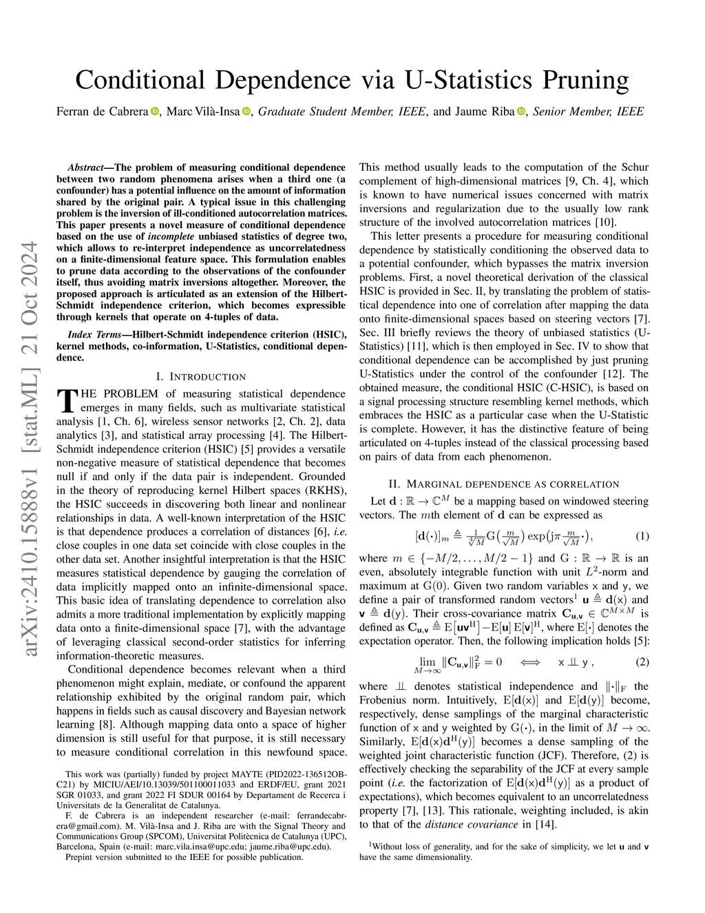 The problem of measuring conditional dependence between two random phenomena arises when a third one (a confounder) has a potential influence on the amount of information between them. A typical issue in this challenging problem is the inversion of ill-conditioned autocorrelation matrices. This paper presents a novel measure of conditional dependence based on the use of incomplete unbiased statistics of degree two, which allows to re-interpret independence as uncorrelatedness on a finite-dimensional feature space. This formulation enables to prune data according to observations of the confounder itself, thus avoiding matrix inversions altogether. The proposed approach is articulated as an extension of the Hilbert-Schmidt independence criterion, which becomes expressible through kernels that operate on 4-tuples of data.