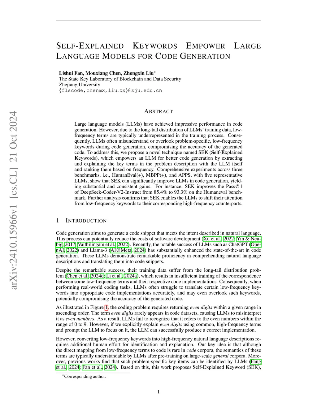 Large language models (LLMs) have achieved impressive performance in code generation. However, due to the long-tail distribution of LLMs' training data, low-frequency terms are typically underrepresented in the training process. Consequently, LLMs often misunderstand or overlook problem-specific, low-frequency keywords during code generation, compromising the accuracy of the generated code. To address this, we propose a novel technique named SEK(\textbf{S}elf-\textbf{E}xplained \textbf{K}eywords), which empowers an LLM for better code generation by extracting and explaining the key terms in the problem description with the LLM itself and ranking them based on frequency. Comprehensive experiments across three benchmarks, i.e., HumanEval(+), MBPP(+), and APPS, with five representative LLMs, show that SEK can significantly improve LLMs in code generation, yielding substantial and consistent gains. For instance, SEK improves the Pass@1 of DeepSeek-Coder-V2-Instruct from 85.4\% to 93.3\% on the Humaneval benchmark. Further analysis confirms that SEK enables the LLMs to shift their attention from low-frequency keywords to their corresponding high-frequency counterparts.