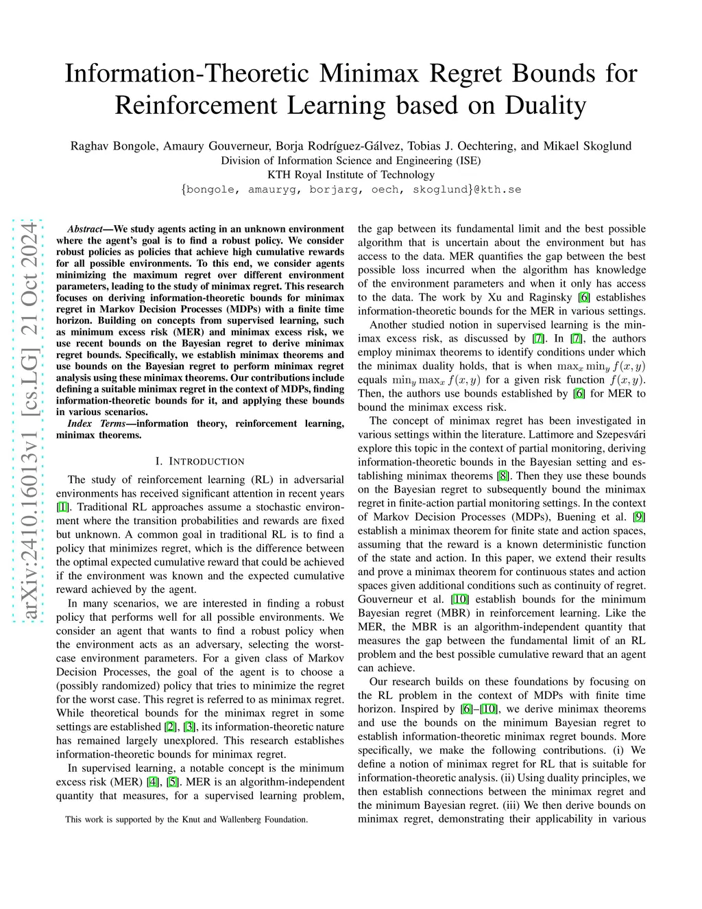 We study agents acting in an unknown environment where the agent's goal is to find a robust policy. We consider robust policies as policies that achieve high cumulative rewards for all possible environments. To this end, we consider agents minimizing the maximum regret over different environment parameters, leading to the study of minimax regret. This research focuses on deriving information-theoretic bounds for minimax regret in Markov Decision Processes (MDPs) with a finite time horizon. Building on concepts from supervised learning, such as minimum excess risk (MER) and minimax excess risk, we use recent bounds on the Bayesian regret to derive minimax regret bounds. Specifically, we establish minimax theorems and use bounds on the Bayesian regret to perform minimax regret analysis using these minimax theorems. Our contributions include defining a suitable minimax regret in the context of MDPs, finding information-theoretic bounds for it, and applying these bounds in various scenarios.