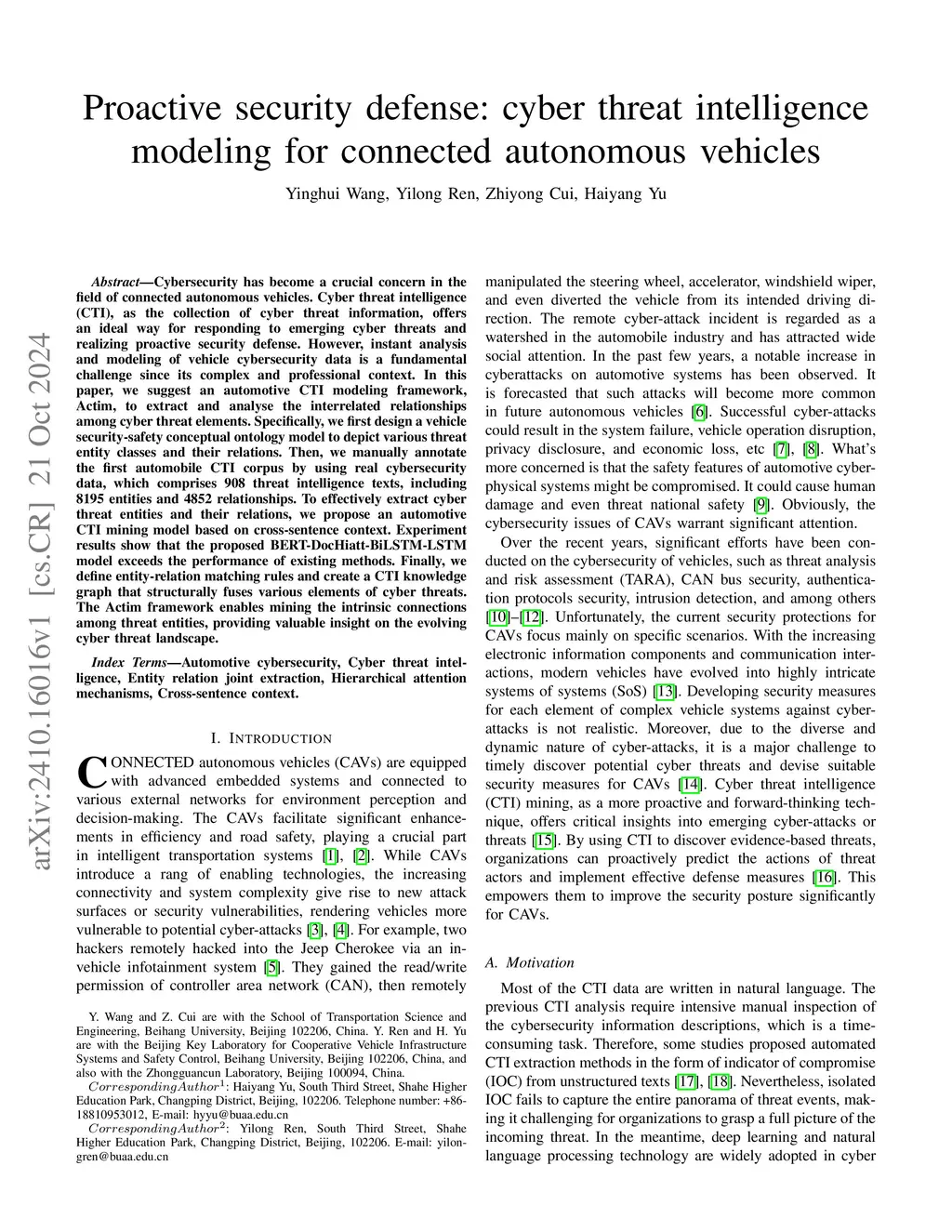 Cybersecurity has become a crucial concern in the field of connected autonomous vehicles. Cyber threat intelligence (CTI), as the collection of cyber threat information, offers an ideal way for responding to emerging cyber threats and realizing proactive security defense. However, instant analysis and modeling of vehicle cybersecurity data is a fundamental challenge since its complex and professional context. In this paper, we suggest an automotive CTI modeling framework, Actim, to extract and analyse the interrelated relationships among cyber threat elements. Specifically, we first design a vehicle security-safety conceptual ontology model to depict various threat entity classes and their relations. Then, we manually annotate the first automobile CTI corpus by using real cybersecurity data, which comprises 908 threat intelligence texts, including 8195 entities and 4852 relationships. To effectively extract cyber threat entities and their relations, we propose an automotive CTI mining model based on cross-sentence context. Experiment results show that the proposed BERT-DocHiatt-BiLSTM-LSTM model exceeds the performance of existing methods. Finally, we define entity-relation matching rules and create a CTI knowledge graph that structurally fuses various elements of cyber threats. The Actim framework enables mining the intrinsic connections among threat entities, providing valuable insight on the evolving cyber threat landscape.