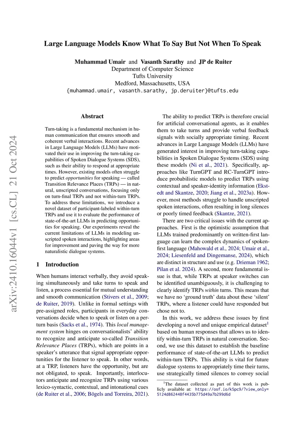 Turn-taking is a fundamental mechanism in human communication that ensures smooth and coherent verbal interactions. Recent advances in Large Language Models (LLMs) have motivated their use in improving the turn-taking capabilities of Spoken Dialogue Systems (SDS), such as their ability to respond at appropriate times. However, existing models often struggle to predict opportunities for speaking -- called Transition Relevance Places (TRPs) -- in natural, unscripted conversations, focusing only on turn-final TRPs and not within-turn TRPs. To address these limitations, we introduce a novel dataset of participant-labeled within-turn TRPs and use it to evaluate the performance of state-of-the-art LLMs in predicting opportunities for speaking. Our experiments reveal the current limitations of LLMs in modeling unscripted spoken interactions, highlighting areas for improvement and paving the way for more naturalistic dialogue systems.
