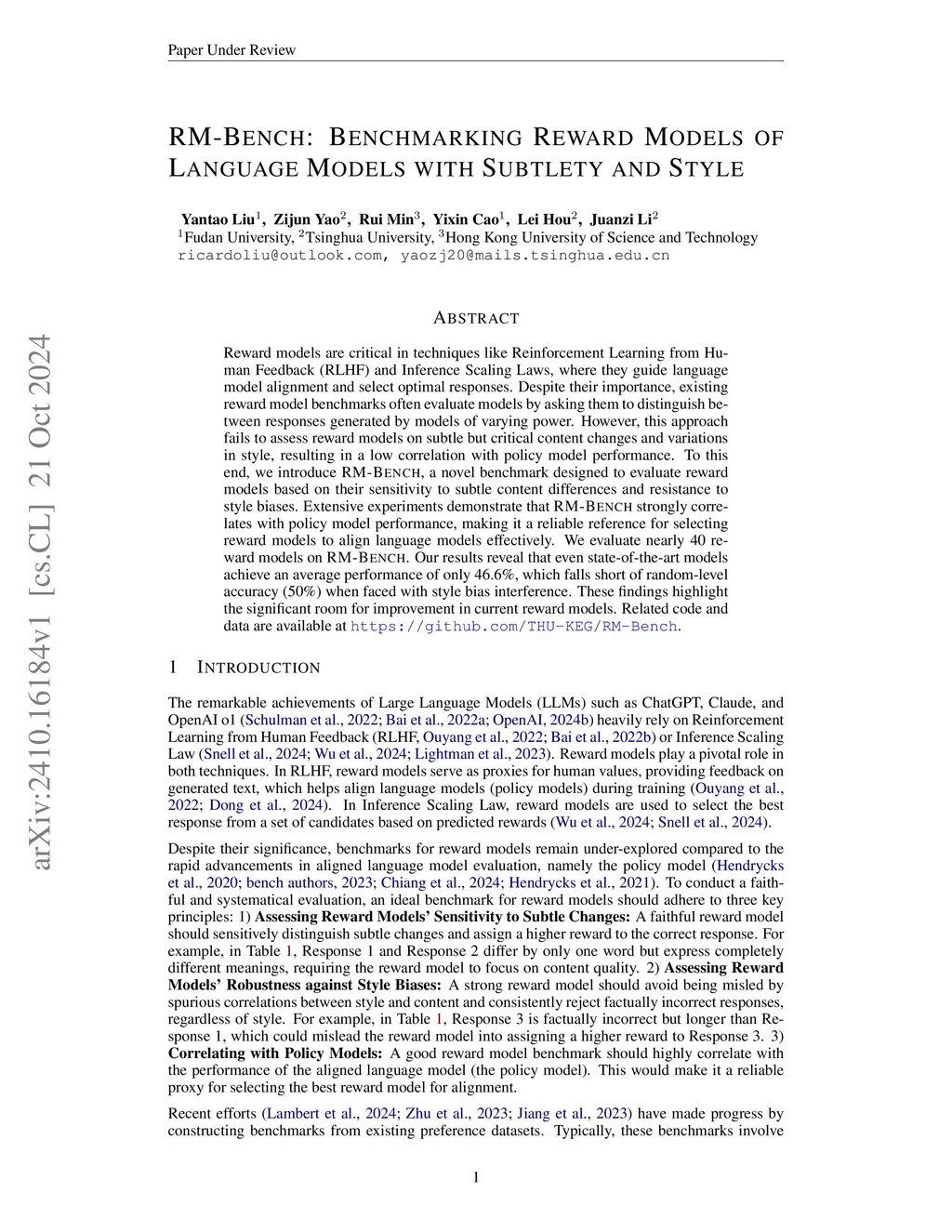 Reward models are critical in techniques like Reinforcement Learning from Human Feedback (RLHF) and Inference Scaling Laws, where they guide language model alignment and select optimal responses. Despite their importance, existing reward model benchmarks often evaluate models by asking them to distinguish between responses generated by models of varying power. However, this approach fails to assess reward models on subtle but critical content changes and variations in style, resulting in a low correlation with policy model performance. To this end, we introduce RM-Bench, a novel benchmark designed to evaluate reward models based on their sensitivity to subtle content differences and resistance to style biases. Extensive experiments demonstrate that RM-Bench strongly correlates with policy model performance, making it a reliable reference for selecting reward models to align language models effectively. We evaluate nearly 40 reward models on RM-Bench. Our results reveal that even state-of-the-art models achieve an average performance of only 46.6%, which falls short of random-level accuracy (50%) when faced with style bias interference. These findings highlight the significant room for improvement in current reward models. Related code and data are available at https://github.com/THU-KEG/RM-Bench.
