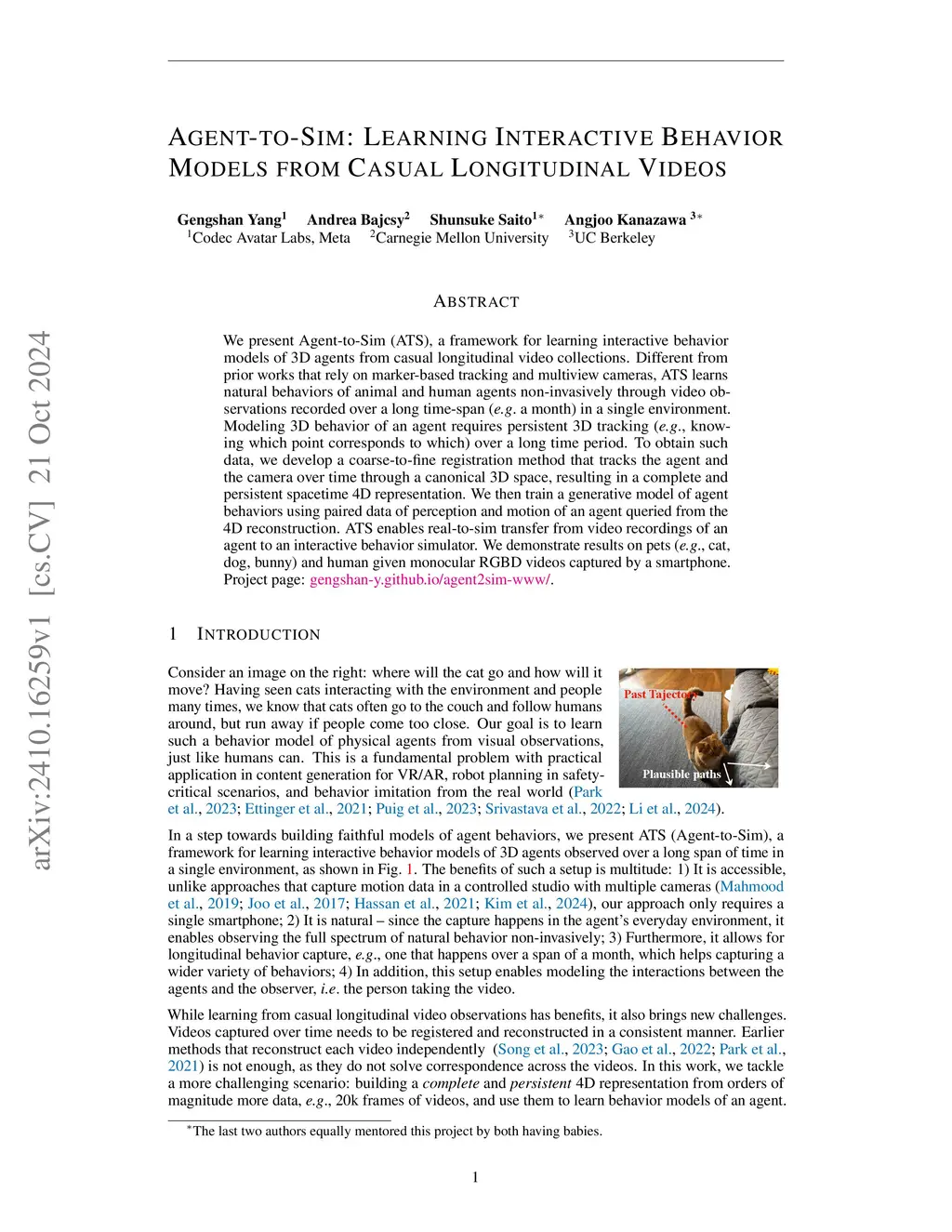 We present Agent-to-Sim (ATS), a framework for learning interactive behavior models of 3D agents from casual longitudinal video collections. Different from prior works that rely on marker-based tracking and multiview cameras, ATS learns natural behaviors of animal and human agents non-invasively through video observations recorded over a long time-span (e.g., a month) in a single environment. Modeling 3D behavior of an agent requires persistent 3D tracking (e.g., knowing which point corresponds to which) over a long time period. To obtain such data, we develop a coarse-to-fine registration method that tracks the agent and the camera over time through a canonical 3D space, resulting in a complete and persistent spacetime 4D representation. We then train a generative model of agent behaviors using paired data of perception and motion of an agent queried from the 4D reconstruction. ATS enables real-to-sim transfer from video recordings of an agent to an interactive behavior simulator. We demonstrate results on pets (e.g., cat, dog, bunny) and human given monocular RGBD videos captured by a smartphone.
