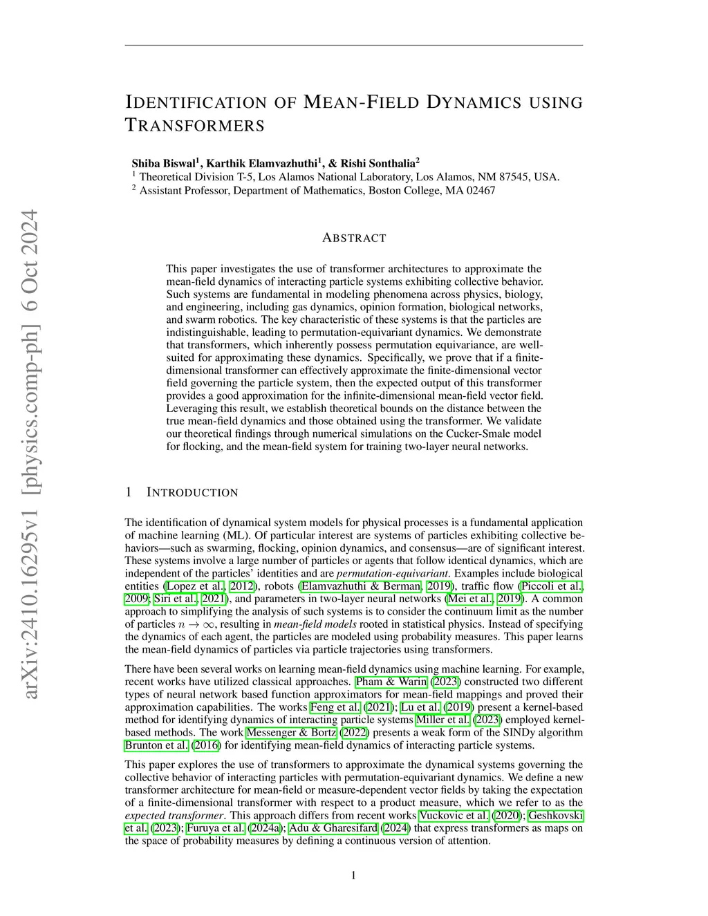 This paper investigates the use of transformers to approximate the mean-field dynamics of interacting particle systems exhibiting collective behavior. Such systems are fundamental in modeling phenomena across physics, biology, and engineering, including opinion formation, biological networks, and swarm robotics. The key characteristic of these systems is that the particles are indistinguishable, leading to permutation-equivariant dynamics. First, we empirically demonstrate that transformers are well-suited for approximating a variety of mean field models, including the Cucker-Smale model for flocking and milling, and the mean-field system for training two-layer neural networks. We validate our numerical experiments via mathematical theory. Specifically, we prove that if a finite-dimensional transformer effectively approximates the finite-dimensional vector field governing the particle system, then the distance between the \textit{expected transformer} and the infinite-dimensional mean-field vector field can be uniformly bounded by a function of the number of particles observed during training. Leveraging this result, we establish theoretical bounds on the distance between the true mean-field dynamics and those obtained using the transformer.