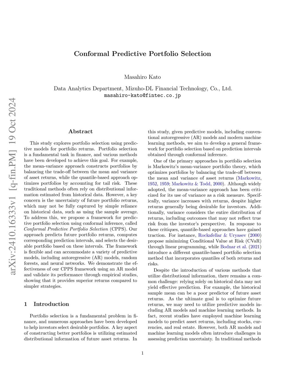 This study examines portfolio selection using predictive models for portfolio returns. Portfolio selection is a fundamental task in finance, and a variety of methods have been developed to achieve this goal. For instance, the mean-variance approach constructs portfolios by balancing the trade-off between the mean and variance of asset returns, while the quantile-based approach optimizes portfolios by considering tail risk. These methods often depend on distributional information estimated from historical data using predictive models, each of which carries its own uncertainty. To address this, we propose a framework for predictive portfolio selection via conformal prediction , called \emph{Conformal Predictive Portfolio Selection} (CPPS). Our approach forecasts future portfolio returns, computes the corresponding prediction intervals, and selects the portfolio of interest based on these intervals. The framework is flexible and can accommodate a wide range of predictive models, including autoregressive (AR) models, random forests, and neural networks. We demonstrate the effectiveness of the CPPS framework by applying it to an AR model and validate its performance through empirical studies, showing that it delivers superior returns compared to simpler strategies.
