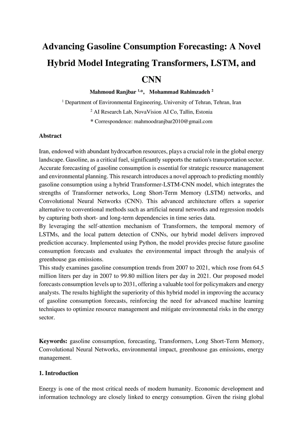 Iran, endowed with abundant hydrocarbon resources, plays a crucial role in the global energy landscape. Gasoline, as a critical fuel, significantly supports the nation's transportation sector. Accurate forecasting of gasoline consumption is essential for strategic resource management and environmental planning. This research introduces a novel approach to predicting monthly gasoline consumption using a hybrid Transformer-LSTM-CNN model, which integrates the strengths of Transformer networks, Long Short-Term Memory (LSTM) networks, and Convolutional Neural Networks (CNN). This advanced architecture offers a superior alternative to conventional methods such as artificial neural networks and regression models by capturing both short- and long-term dependencies in time series data. By leveraging the self-attention mechanism of Transformers, the temporal memory of LSTMs, and the local pattern detection of CNNs, our hybrid model delivers improved prediction accuracy. Implemented using Python, the model provides precise future gasoline consumption forecasts and evaluates the environmental impact through the analysis of greenhouse gas emissions. This study examines gasoline consumption trends from 2007 to 2021, which rose from 64.5 million liters per day in 2007 to 99.80 million liters per day in 2021. Our proposed model forecasts consumption levels up to 2031, offering a valuable tool for policymakers and energy analysts. The results highlight the superiority of this hybrid model in improving the accuracy of gasoline consumption forecasts, reinforcing the need for advanced machine learning techniques to optimize resource management and mitigate environmental risks in the energy sector.