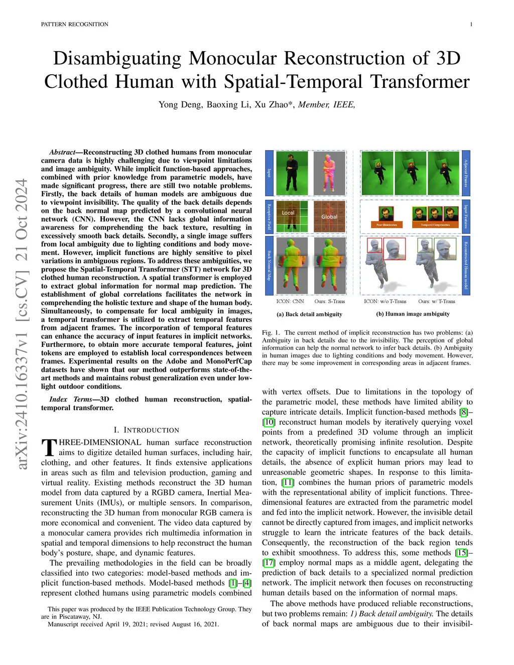Reconstructing 3D clothed humans from monocular camera data is highly challenging due to viewpoint limitations and image ambiguity. While implicit function-based approaches, combined with prior knowledge from parametric models, have made significant progress, there are still two notable problems. Firstly, the back details of human models are ambiguous due to viewpoint invisibility. The quality of the back details depends on the back normal map predicted by a convolutional neural network (CNN). However, the CNN lacks global information awareness for comprehending the back texture, resulting in excessively smooth back details. Secondly, a single image suffers from local ambiguity due to lighting conditions and body movement. However, implicit functions are highly sensitive to pixel variations in ambiguous regions. To address these ambiguities, we propose the Spatial-Temporal Transformer (STT) network for 3D clothed human reconstruction. A spatial transformer is employed to extract global information for normal map prediction. The establishment of global correlations facilitates the network in comprehending the holistic texture and shape of the human body. Simultaneously, to compensate for local ambiguity in images, a temporal transformer is utilized to extract temporal features from adjacent frames. The incorporation of temporal features can enhance the accuracy of input features in implicit networks. Furthermore, to obtain more accurate temporal features, joint tokens are employed to establish local correspondences between frames. Experimental results on the Adobe and MonoPerfCap datasets have shown that our method outperforms state-of-the-art methods and maintains robust generalization even under low-light outdoor conditions.