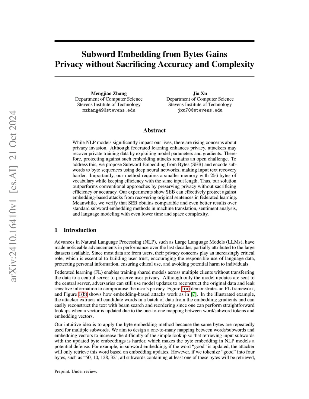 While NLP models significantly impact our lives, there are rising concerns about privacy invasion. Although federated learning enhances privacy, attackers may recover private training data by exploiting model parameters and gradients. Therefore, protecting against such embedding attacks remains an open challenge. To address this, we propose Subword Embedding from Bytes (SEB) and encode subwords to byte sequences using deep neural networks, making input text recovery harder. Importantly, our method requires a smaller memory with bytes of vocabulary while keeping efficiency with the same input length. Thus, our solution outperforms conventional approaches by preserving privacy without sacrificing efficiency or accuracy. Our experiments show SEB can effectively protect against embedding-based attacks from recovering original sentences in federated learning. Meanwhile, we verify that SEB obtains comparable and even better results over standard subword embedding methods in machine translation, sentiment analysis, and language modeling with even lower time and space complexity.