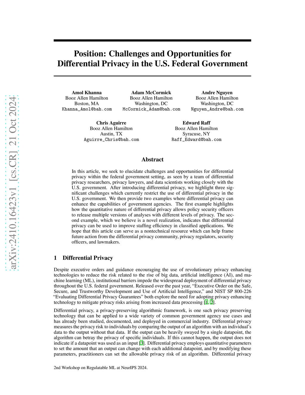 In this article, we seek to elucidate challenges and opportunities for differential privacy within the federal government setting, as seen by a team of differential privacy researchers, privacy lawyers, and data scientists working closely with the U.S. government. After introducing differential privacy, we highlight three significant challenges which currently restrict the use of differential privacy in the U.S. government. We then provide two examples where differential privacy can enhance the capabilities of government agencies. The first example highlights how the quantitative nature of differential privacy allows policy security officers to release multiple versions of analyses with different levels of privacy. The second example, which we believe is a novel realization, indicates that differential privacy can be used to improve staffing efficiency in classified applications. We hope that this article can serve as a nontechnical resource which can help frame future action from the differential privacy community, privacy regulators, security officers, and lawmakers.