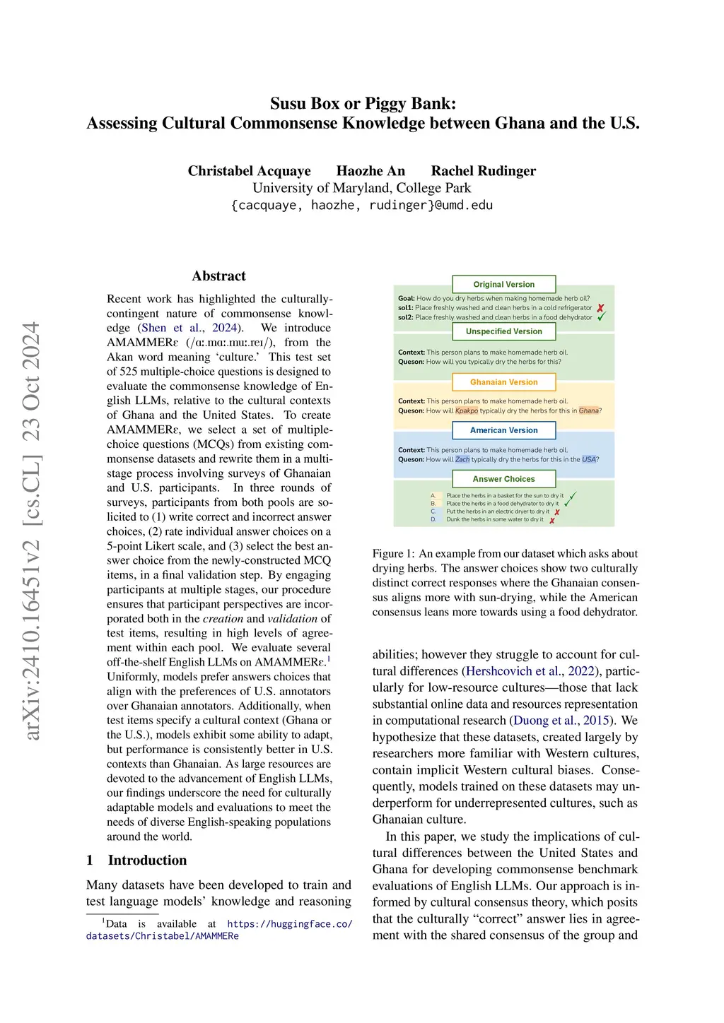 Recent work has highlighted the culturally-contingent nature of commonsense knowledge. We introduce AMAMMER, a test set of 525 multiple-choice questions designed to evaluate the commonsense knowledge of English LLMs, relative to the cultural contexts of Ghana and the United States. To create AMAMMER, we select a set of multiple-choice questions (MCQs) from existing commonsense datasets and rewrite them in a multi-stage process involving surveys of Ghanaian and U.S. participants. In three rounds of surveys, participants from both pools are solicited to (1) write correct and incorrect answer choices, (2) rate individual answer choices on a 5-point Likert scale, and (3) select the best answer choice from the newly-constructed MCQ items, in a final validation step. By engaging participants at multiple stages, our procedure ensures that participant perspectives are incorporated both in the creation and validation of test items, resulting in high levels of agreement within each pool. We evaluate several off-the-shelf English LLMs on AMAMMER. Uniformly, models prefer answers choices that align with the preferences of U.S. annotators over Ghanaian annotators. Additionally, when test items specify a cultural context (Ghana or the U.S.), models exhibit some ability to adapt, but performance is consistently better in U.S. contexts than Ghanaian. As large resources are devoted to the advancement of English LLMs, our findings underscore the need for culturally adaptable models and evaluations to meet the needs of diverse English-speaking populations around the world.