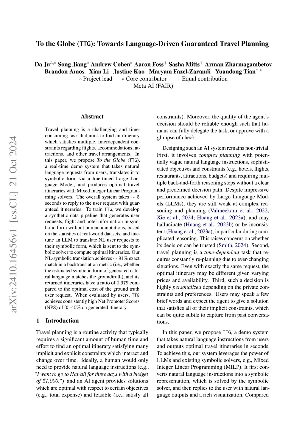 Travel planning is a challenging and time-consuming task that aims to find an itinerary which satisfies multiple, interdependent constraints regarding flights, accommodations, attractions, and other travel arrangements. In this paper, we propose To the Globe (TTG), a real-time demo system that takes natural language requests from users, translates it to symbolic form via a fine-tuned Large Language Model, and produces optimal travel itineraries with Mixed Integer Linear Programming solvers. The overall system takes ~5 seconds to reply to the user request with guaranteed itineraries. To train TTG, we develop a synthetic data pipeline that generates user requests, flight and hotel information in symbolic form without human annotations, based on the statistics of real-world datasets, and fine-tune an LLM to translate NL user requests to their symbolic form, which is sent to the symbolic solver to compute optimal itineraries. Our NL-symbolic translation achieves ~91% exact match in a backtranslation metric (i.e., whether the estimated symbolic form of generated natural language matches the groundtruth), and its returned itineraries have a ratio of 0.979 compared to the optimal cost of the ground truth user request. When evaluated by users, TTG achieves consistently high Net Promoter Scores (NPS) of 35-40% on generated itinerary.