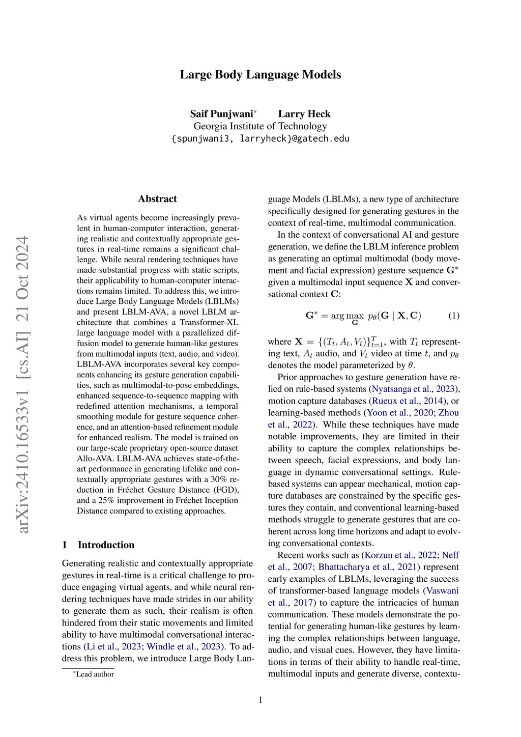 As virtual agents become increasingly prevalent in human-computer interaction, generating realistic and contextually appropriate gestures in real-time remains a significant challenge. While neural rendering techniques have made substantial progress with static scripts, their applicability to human-computer interactions remains limited. To address this, we introduce Large Body Language Models (LBLMs) and present LBLM-AVA, a novel LBLM architecture that combines a Transformer-XL large language model with a parallelized diffusion model to generate human-like gestures from multimodal inputs (text, audio, and video). LBLM-AVA incorporates several key components enhancing its gesture generation capabilities, such as multimodal-to-pose embeddings, enhanced sequence-to-sequence mapping with redefined attention mechanisms, a temporal smoothing module for gesture sequence coherence, and an attention-based refinement module for enhanced realism. The model is trained on our large-scale proprietary open-source dataset Allo-AVA. LBLM-AVA achieves state-of-the-art performance in generating lifelike and contextually appropriate gestures with a 30% reduction in Fr\échet Gesture Distance (FGD), and a 25% improvement in Fr\échet Inception Distance compared to existing approaches.