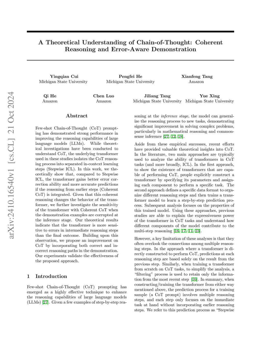Few-shot Chain-of-Thought (CoT) prompting has demonstrated strong performance in improving the reasoning capabilities of large language models (LLMs). While theoretical investigations have been conducted to understand CoT, the underlying transformer used in these studies isolates the CoT reasoning process into separated in-context learning steps (Stepwise ICL). In this work, we theoretically show that, compared to Stepwise ICL, the transformer gains better error correction ability and more accurate predictions if the reasoning from earlier steps (Coherent CoT) is integrated. Given that this coherent reasoning changes the behavior of the transformer, we further investigate the sensitivity of the transformer with Coherent CoT when the demonstration examples are corrupted at the inference stage. Our theoretical results indicate that the transformer is more sensitive to errors in intermediate reasoning steps than the final outcome. Building upon this observation, we propose an improvement on CoT by incorporating both correct and incorrect reasoning paths in the demonstration. Our experiments validate the effectiveness of the proposed approach.