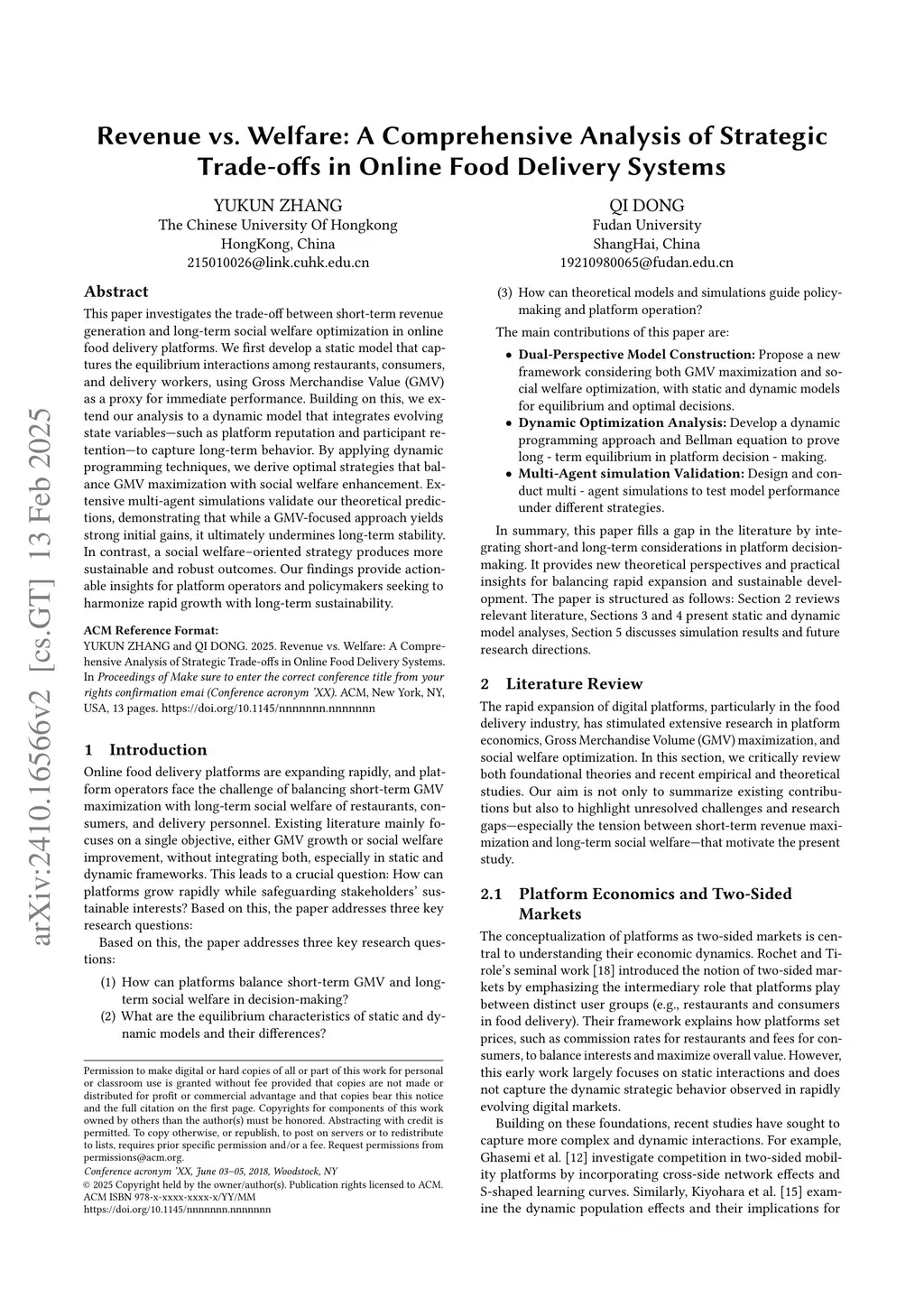 This paper investigates the trade-off between short-term revenue generation and long-term social welfare optimization in online food delivery platforms. We first develop a static model that captures the equilibrium interactions among restaurants, consumers, and delivery workers, using Gross Merchandise Value (GMV) as a proxy for immediate performance. Building on this, we extend our analysis to a dynamic model that integrates evolving state variables,such as platform reputation and participant retention-to capture long-term behavior. By applying dynamic programming techniques, we derive optimal strategies that balance GMV maximization with social welfare enhancement. Extensive multi-agent simulations validate our theoretical predictions, demonstrating that while a GMV-focused approach yields strong initial gains, it ultimately undermines long-term stability. In contrast, a social welfare-oriented strategy produces more sustainable and robust outcomes. Our findings provide actionable insights for platform operators and policymakers seeking to harmonize rapid growth with long-term
