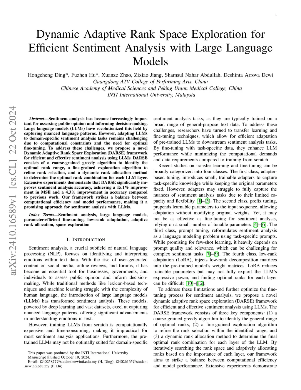 Sentiment analysis has become increasingly important for assessing public opinion and informing decision-making. Large language models (LLMs) have revolutionized this field by capturing nuanced language patterns. However, adapting LLMs to domain-specific sentiment analysis tasks remains challenging due to computational constraints and the need for optimal fine-tuning. To address these challenges, we propose a novel Dynamic Adaptive Rank Space Exploration (DARSE) framework for efficient and effective sentiment analysis using LLMs. DARSE consists of a coarse-grained greedy algorithm to identify the optimal rank range, a fine-grained exploration algorithm to refine rank selection, and a dynamic rank allocation method to determine the optimal rank combination for each LLM layer. Extensive experiments demonstrate that DARSE significantly improves sentiment analysis accuracy, achieving a 15.1% improvement in MSE and a 4.3% improvement in accuracy compared to previous work. Our framework strikes a balance between computational efficiency and model performance, making it a promising approach for sentiment analysis with LLMs.
