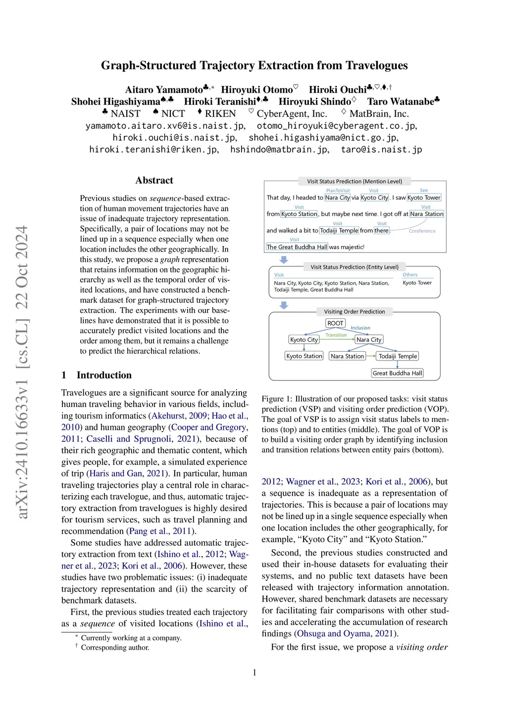 Previous studies on sequence-based extraction of human movement trajectories have an issue of inadequate trajectory representation. Specifically, a pair of locations may not be lined up in a sequence especially when one location includes the other geographically. In this study, we propose a graph representation that retains information on the geographic hierarchy as well as the temporal order of visited locations, and have constructed a benchmark dataset for graph-structured trajectory extraction. The experiments with our baselines have demonstrated that it is possible to accurately predict visited locations and the order among them, but it remains a challenge to predict the hierarchical relations.