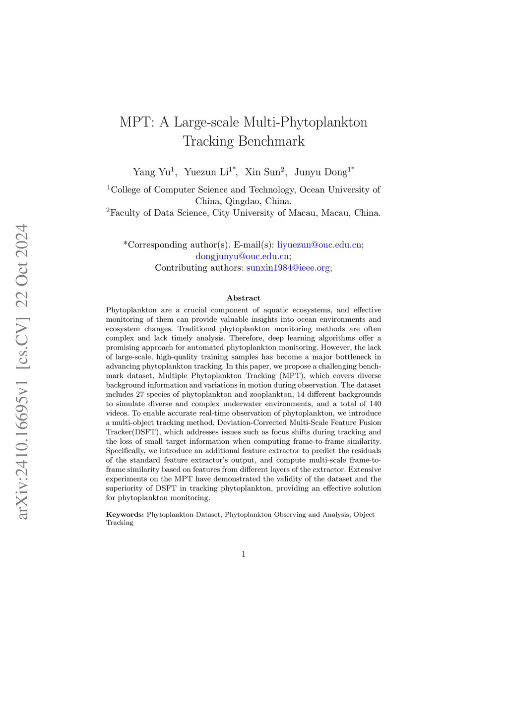 Phytoplankton are a crucial component of aquatic ecosystems, and effective monitoring of them can provide valuable insights into ocean environments and ecosystem changes. Traditional phytoplankton monitoring methods are often complex and lack timely analysis. Therefore, deep learning algorithms offer a promising approach for automated phytoplankton monitoring. However, the lack of large-scale, high-quality training samples has become a major bottleneck in advancing phytoplankton tracking. In this paper, we propose a challenging benchmark dataset, Multiple Phytoplankton Tracking (MPT), which covers diverse background information and variations in motion during observation. The dataset includes 27 species of phytoplankton and zooplankton, 14 different backgrounds to simulate diverse and complex underwater environments, and a total of 140 videos. To enable accurate real-time observation of phytoplankton, we introduce a multi-object tracking method, Deviation-Corrected Multi-Scale Feature Fusion Tracker(DSFT), which addresses issues such as focus shifts during tracking and the loss of small target information when computing frame-to-frame similarity. Specifically, we introduce an additional feature extractor to predict the residuals of the standard feature extractor's output, and compute multi-scale frame-to-frame similarity based on features from different layers of the extractor. Extensive experiments on the MPT have demonstrated the validity of the dataset and the superiority of DSFT in tracking phytoplankton, providing an effective solution for phytoplankton monitoring.
