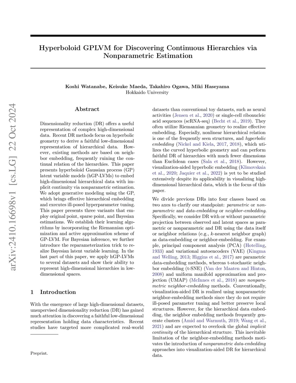 Dimensionality reduction (DR) offers a useful representation of complex high-dimensional data. Recent DR methods focus on hyperbolic geometry to derive a faithful low-dimensional representation of hierarchical data. However, existing methods are based on neighbor embedding, frequently ruining the continual relation of the hierarchies. This paper presents hyperboloid Gaussian process (GP) latent variable models (hGP-LVMs) to embed high-dimensional hierarchical data with implicit continuity via nonparametric estimation. We adopt generative modeling using the GP, which brings effective hierarchical embedding and executes ill-posed hyperparameter tuning. This paper presents three variants that employ original point, sparse point, and Bayesian estimations. We establish their learning algorithms by incorporating the Riemannian optimization and active approximation scheme of GP-LVM. For Bayesian inference, we further introduce the reparameterization trick to realize Bayesian latent variable learning. In the last part of this paper, we apply hGP-LVMs to several datasets and show their ability to represent high-dimensional hierarchies in low-dimensional spaces.