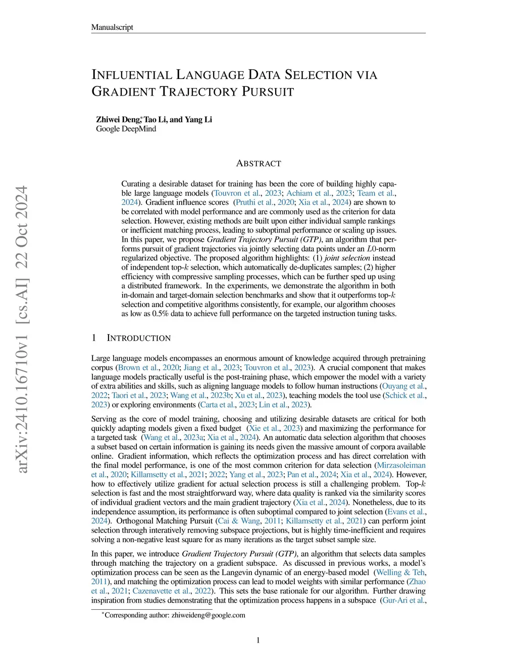 Curating a desirable dataset for training has been the core of building highly capable large language models (Touvron et al., 2023; Achiam et al., 2023; Team et al.,2024). Gradient influence scores (Pruthi et al., 2020; Xia et al., 2024) are shown to be correlated with model performance and are commonly used as the criterion for data selection. However, existing methods are built upon either individual sample rankings or inefficient matching process, leading to suboptimal performance or scaling up issues.In this paper, we propose Gradient Trajectory Pursuit (GTP), an algorithm that performs pursuit of gradient trajectories via jointly selecting data points under an L0-norm regularized objective. The proposed algorithm highlights: (1) joint selection instead of independent top-k selection, which automatically de-duplicates samples; (2) higher efficiency with compressive sampling processes, which can be further sped up using a distributed framework. In the experiments, we demonstrate the algorithm in both in-domain and target-domain selection benchmarks and show that it outperforms top-k selection and competitive algorithms consistently, for example, our algorithm chooses as low as 0.5% data to achieve full performance on the targeted instruction tuning tasks