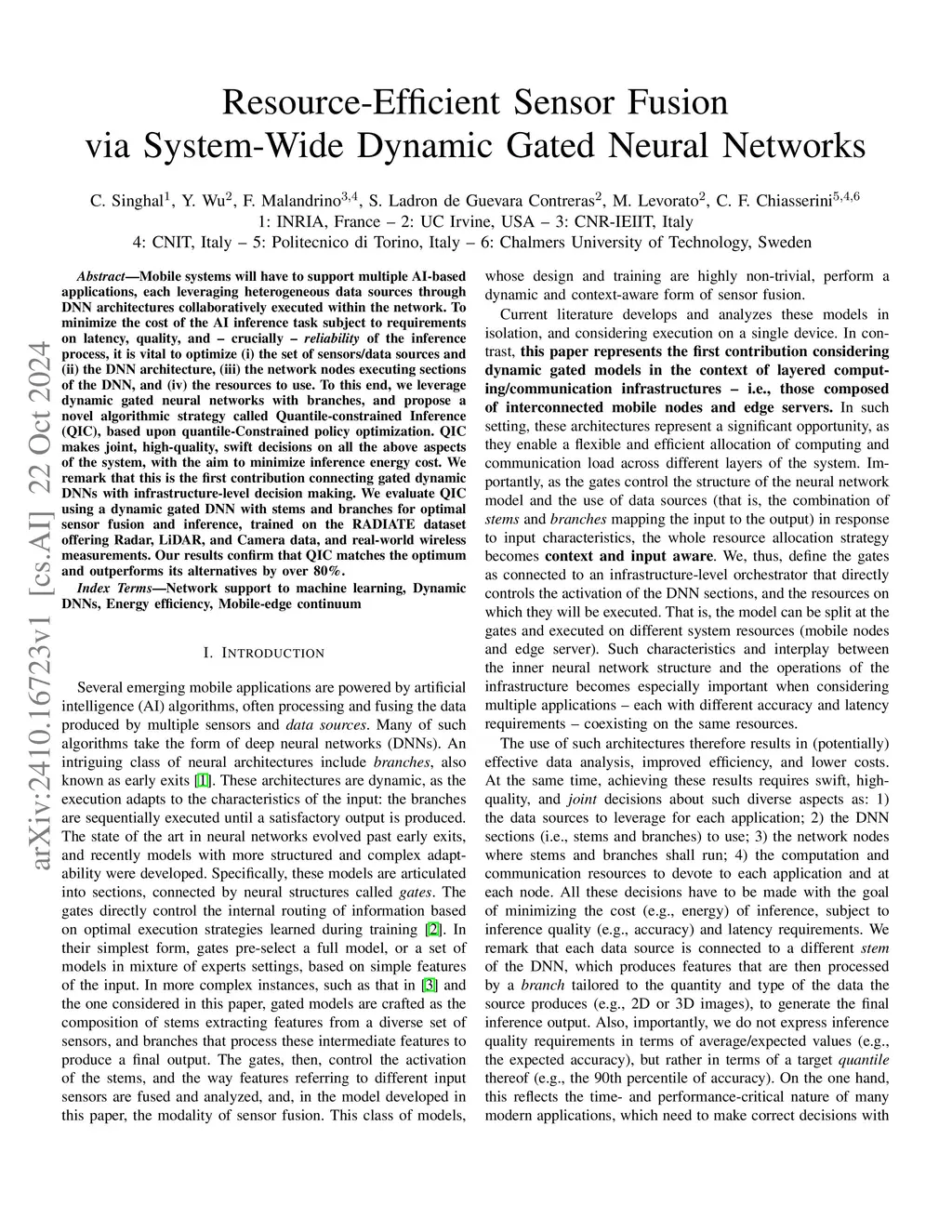Mobile systems will have to support multiple AI-based applications, each leveraging heterogeneous data sources through DNN architectures collaboratively executed within the network. To minimize the cost of the AI inference task subject to requirements on latency, quality, and - crucially - reliability of the inference process, it is vital to optimize (i) the set of sensors/data sources and (ii) the DNN architecture, (iii) the network nodes executing sections of the DNN, and (iv) the resources to use. To this end, we leverage dynamic gated neural networks with branches, and propose a novel algorithmic strategy called Quantile-constrained Inference (QIC), based upon quantile-Constrained policy optimization. QIC makes joint, high-quality, swift decisions on all the above aspects of the system, with the aim to minimize inference energy cost. We remark that this is the first contribution connecting gated dynamic DNNs with infrastructure-level decision making. We evaluate QIC using a dynamic gated DNN with stems and branches for optimal sensor fusion and inference, trained on the RADIATE dataset offering Radar, LiDAR, and Camera data, and real-world wireless measurements. Our results confirm that QIC matches the optimum and outperforms its alternatives by over 80%.