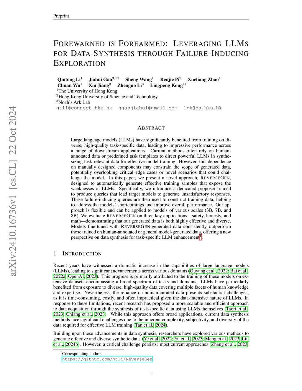 Large language models (LLMs) have significantly benefited from training on diverse, high-quality task-specific data, leading to impressive performance across a range of downstream applications. Current methods often rely on human-annotated data or predefined task templates to direct powerful LLMs in synthesizing task-relevant data for effective model training. However, this dependence on manually designed components may constrain the scope of generated data, potentially overlooking critical edge cases or novel scenarios that could challenge the model. In this paper, we present a novel approach, ReverseGen, designed to automatically generate effective training samples that expose the weaknesses of LLMs. Specifically, we introduce a dedicated proposer trained to produce queries that lead target models to generate unsatisfactory responses. These failure-inducing queries are then used to construct training data, helping to address the models' shortcomings and improve overall performance. Our approach is flexible and can be applied to models of various scales (3B, 7B, and 8B). We evaluate ReverseGen on three key applications (safety, honesty, and math), demonstrating that our generated data is both highly effective and diverse. Models fine-tuned with ReverseGen-generated data consistently outperform those trained on human-annotated or general model-generated data, offering a new perspective on data synthesis for task-specific LLM enhancement.