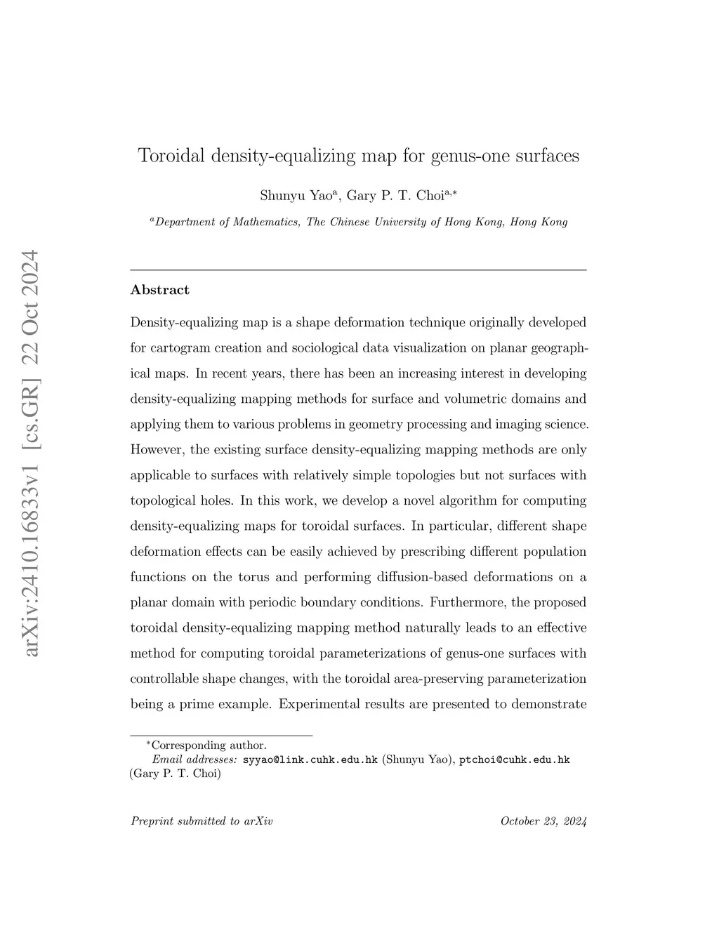 Toroidal density-equalizing map for genus-one surfaces
