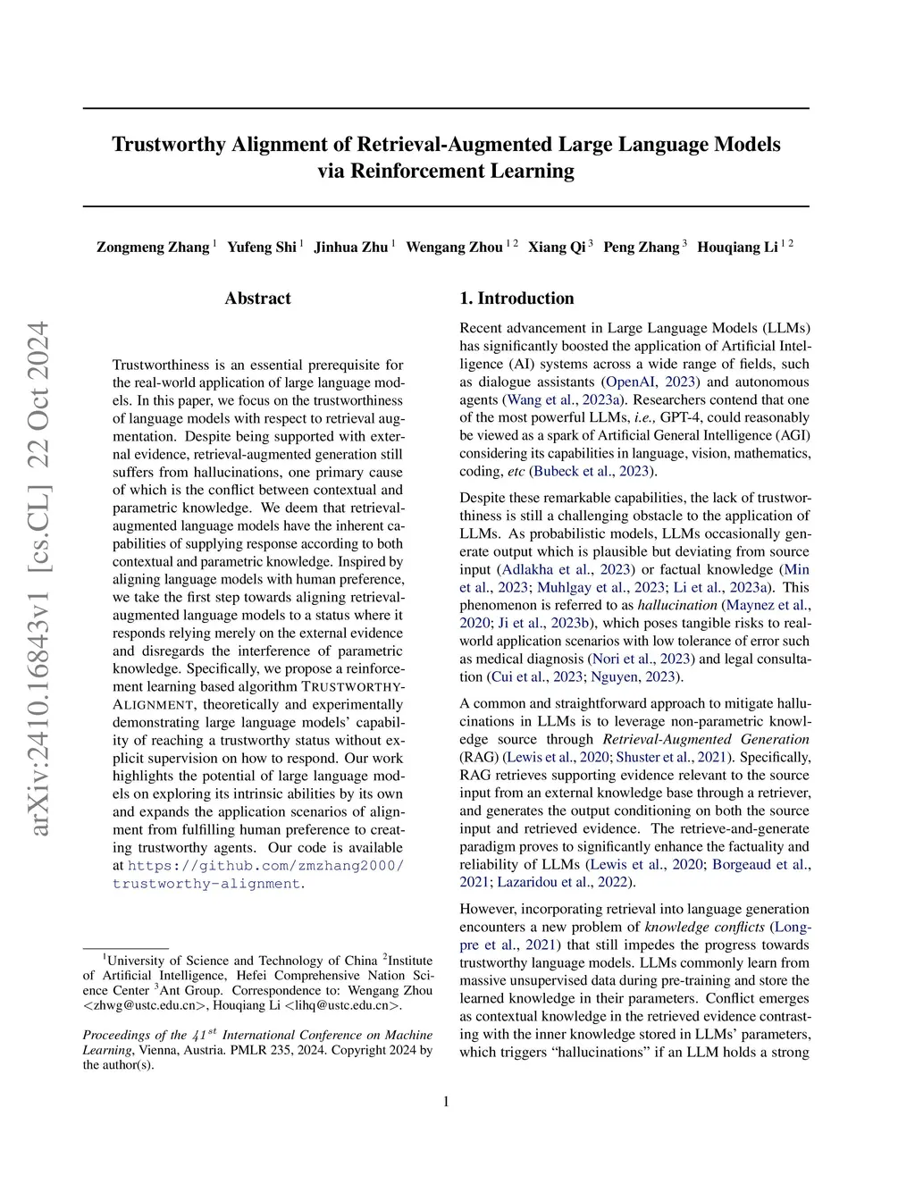 Trustworthiness is an essential prerequisite for the real-world application of large language models. In this paper, we focus on the trustworthiness of language models with respect to retrieval augmentation. Despite being supported with external evidence, retrieval-augmented generation still suffers from hallucinations, one primary cause of which is the conflict between contextual and parametric knowledge. We deem that retrieval-augmented language models have the inherent capabilities of supplying response according to both contextual and parametric knowledge. Inspired by aligning language models with human preference, we take the first step towards aligning retrieval-augmented language models to a status where it responds relying merely on the external evidence and disregards the interference of parametric knowledge. Specifically, we propose a reinforcement learning based algorithm Trustworthy-Alignment, theoretically and experimentally demonstrating large language models' capability of reaching a trustworthy status without explicit supervision on how to respond. Our work highlights the potential of large language models on exploring its intrinsic abilities by its own and expands the application scenarios of alignment from fulfilling human preference to creating trustworthy agents.