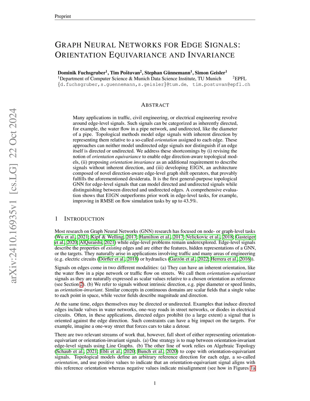 Many applications in traffic, civil engineering, or electrical engineering revolve around edge-level signals. Such signals can be categorized as inherently directed, for example, the water flow in a pipe network, and undirected, like the diameter of a pipe. Topological methods model edge signals with inherent direction by representing them relative to a so-called orientation assigned to each edge. These approaches can neither model undirected edge signals nor distinguish if an edge itself is directed or undirected. We address these shortcomings by (i) revising the notion of orientation equivariance to enable edge direction-aware topological models, (ii) proposing orientation invariance as an additional requirement to describe signals without inherent direction, and (iii) developing EIGN, an architecture composed of novel direction-aware edge-level graph shift operators, that provably fulfills the aforementioned desiderata. It is the first general-purpose topological GNN for edge-level signals that can model directed and undirected signals while distinguishing between directed and undirected edges. A comprehensive evaluation shows that EIGN outperforms prior work in edge-level tasks, for example, improving in RMSE on flow simulation tasks by up to 23.5%.