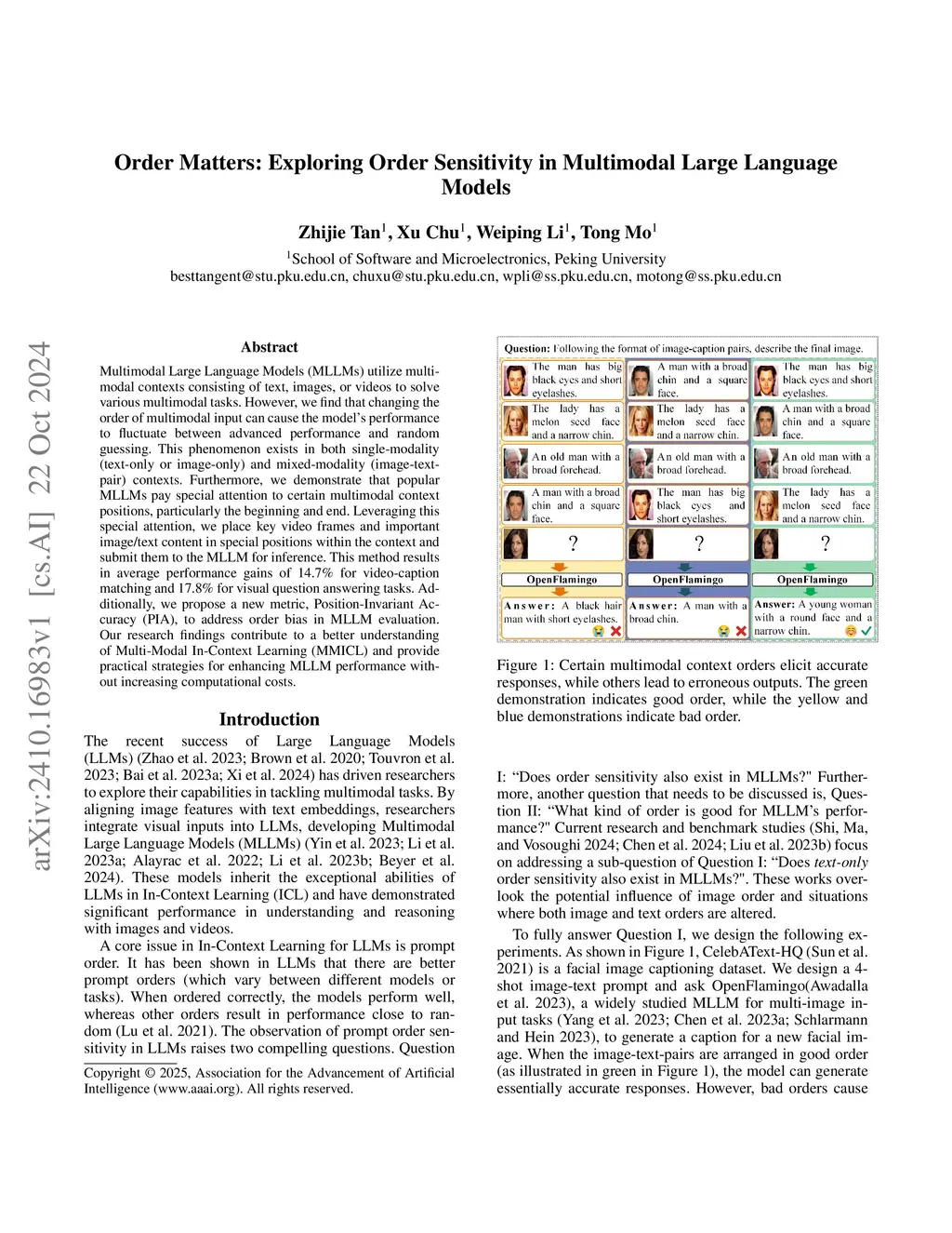Multimodal Large Language Models (MLLMs) utilize multimodal contexts consisting of text, images, or videos to solve various multimodal tasks. However, we find that changing the order of multimodal input can cause the model's performance to fluctuate between advanced performance and random guessing. This phenomenon exists in both single-modality (text-only or image-only) and mixed-modality (image-text-pair) contexts. Furthermore, we demonstrate that popular MLLMs pay special attention to certain multimodal context positions, particularly the beginning and end. Leveraging this special attention, we place key video frames and important image/text content in special positions within the context and submit them to the MLLM for inference. This method results in average performance gains of 14.7% for video-caption matching and 17.8% for visual question answering tasks. Additionally, we propose a new metric, Position-Invariant Accuracy (PIA), to address order bias in MLLM evaluation. Our research findings contribute to a better understanding of Multi-Modal In-Context Learning (MMICL) and provide practical strategies for enhancing MLLM performance without increasing computational costs.