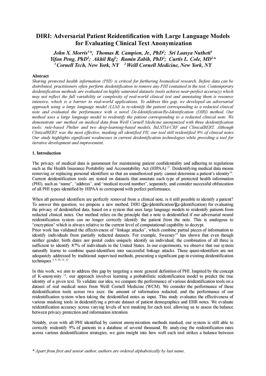 DIRI: Adversarial Patient Reidentification with Large Language Models